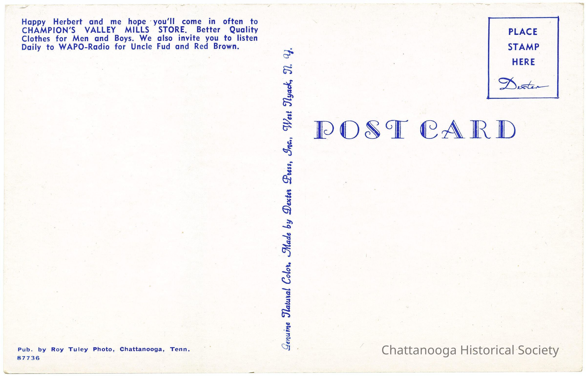 A postcard with the front showing f photograph of WAPO radio personality, "Happy Herbert," advertising Champion's Valley Mills Store. The rear reads "Happy Herbert and me hope you'll come in often to CHAMPION'S VALLEY MILLS STORE. Better quality Clothes for Men and Boys. We also invite you to listen Daily to WAPO-Radio for Uncle Bud and Red Brown."Subject Person/Organization