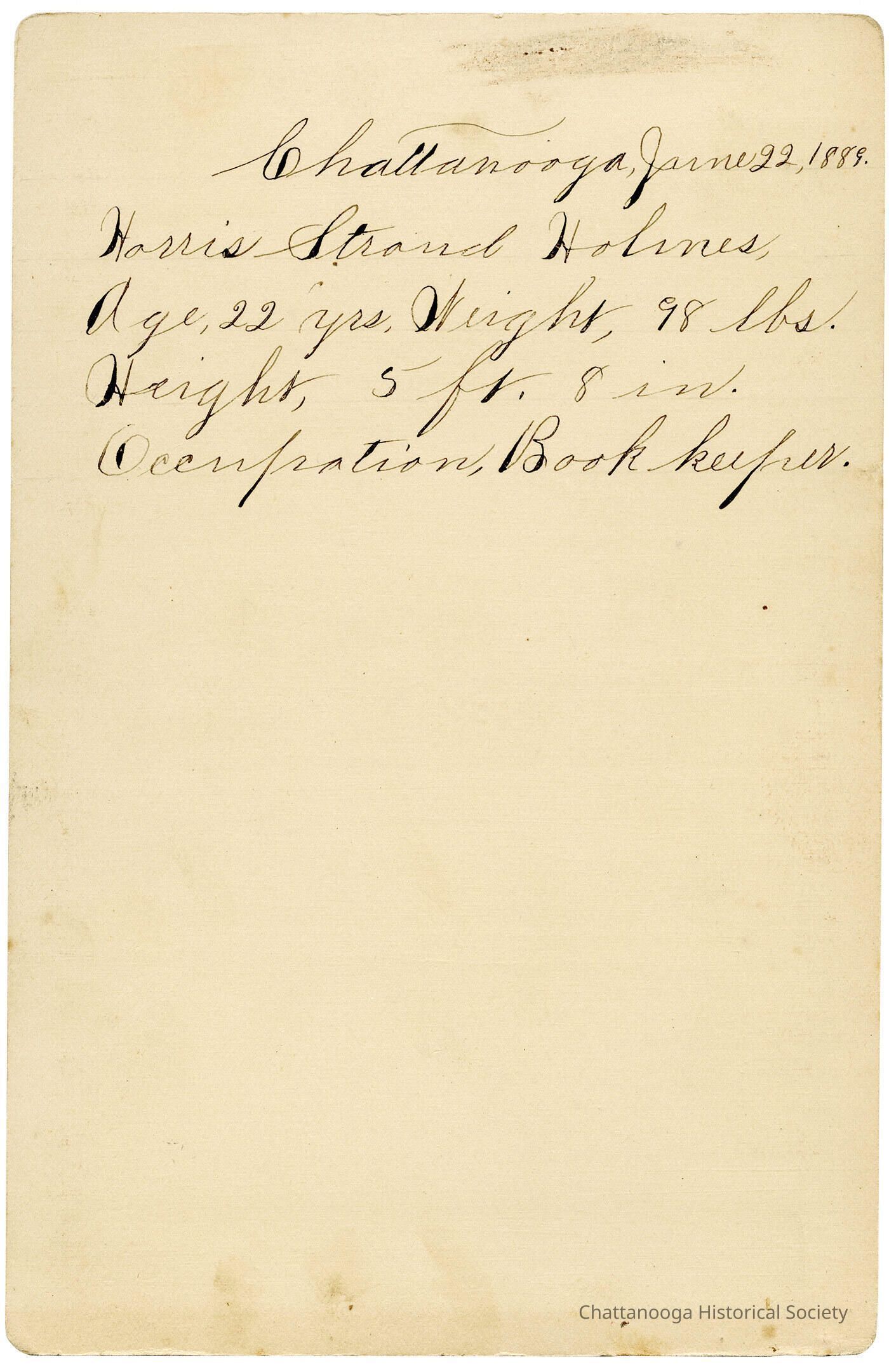 Ink handwriting on the rear reads "Chattanooga, June 22,1889. Harris Strand Holmes, Age 22 yrs, Weight, 98 lbs., Height, 5 ft. 8 in. Occupation, Bookkeeper."Photograph Details