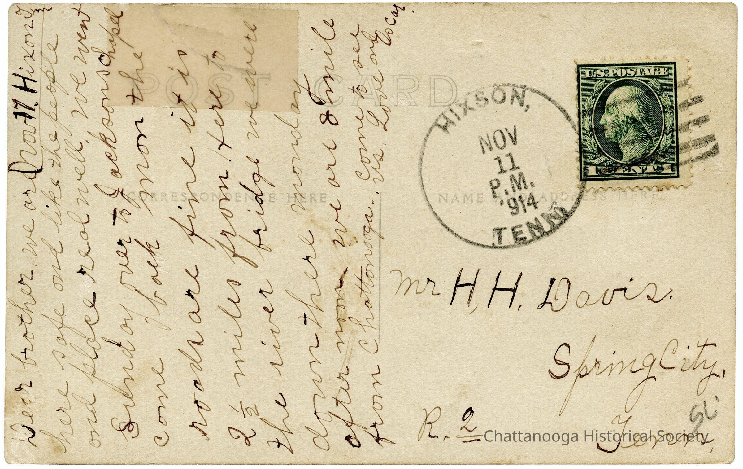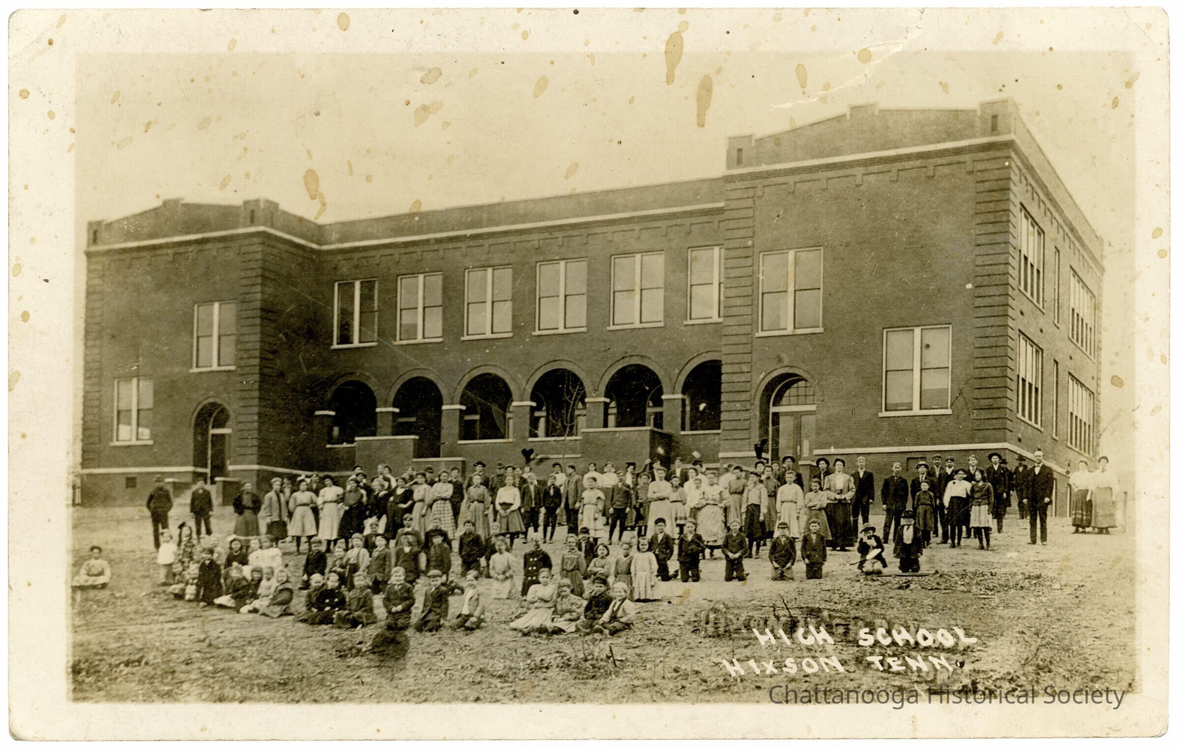 A gelatin-silver printed photograph postcard with the front showing a photograph of the high school in Hixson, Tennessee. The student body is posed in front fo the schoolSubject Place