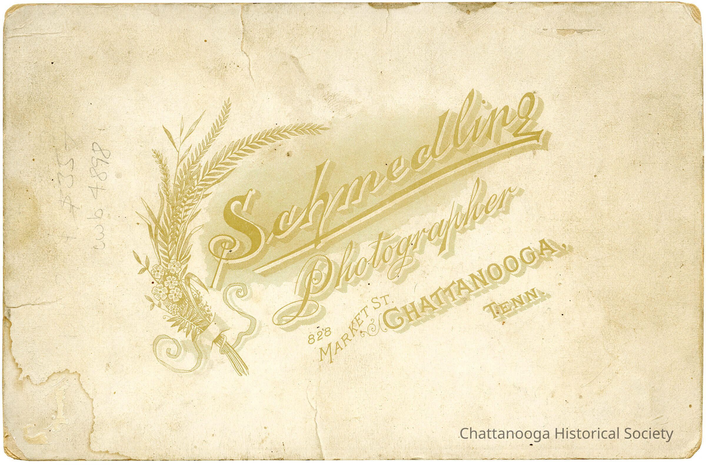 The rear has a lithograph of a gathered bunch of flowers and fern next to an elaborate font that reads "Scmedling Photographer, 828 Market St, Chattanooga, Tenn."Photograph Details