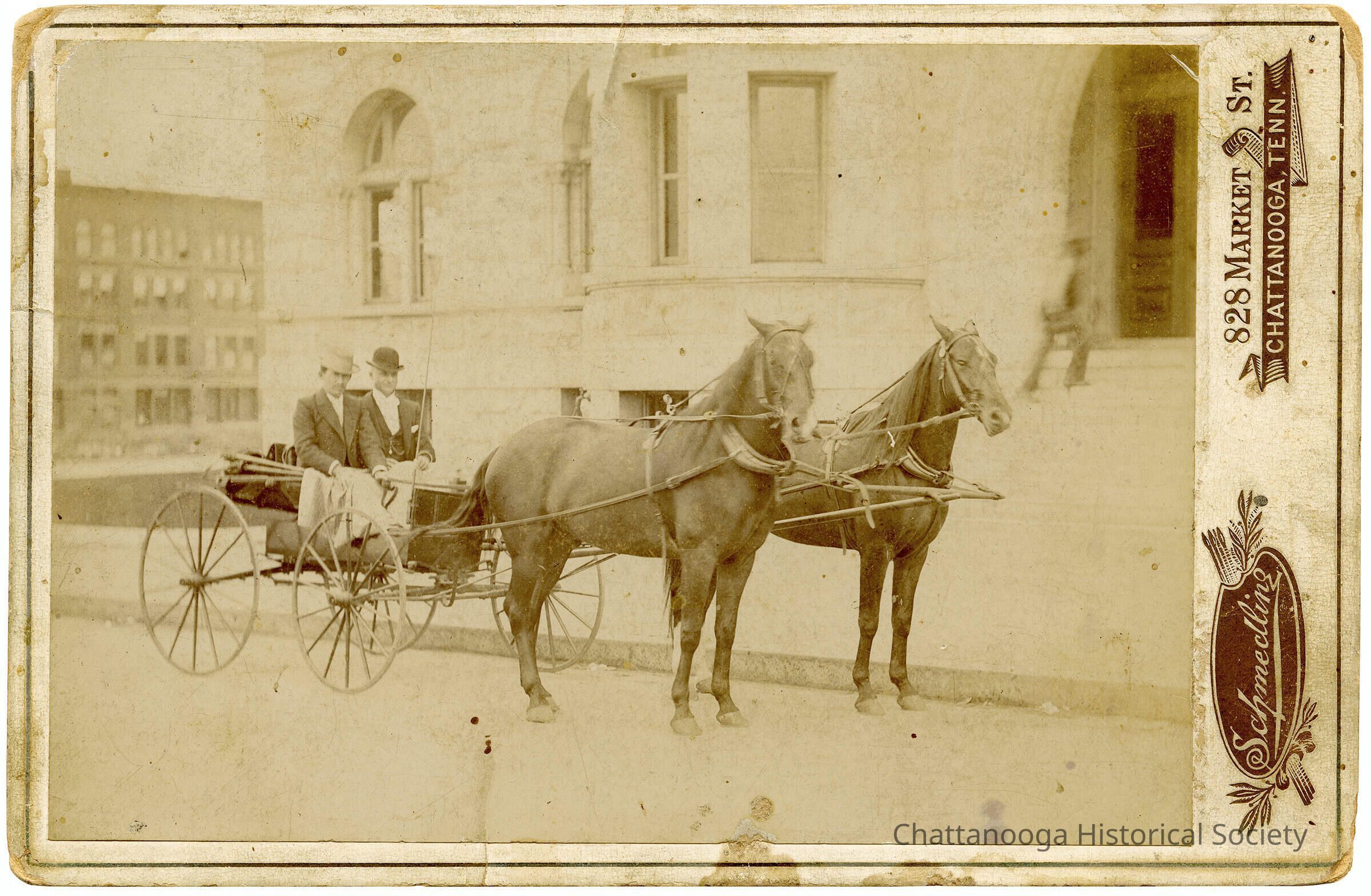 A black and white photograph mounted vertically on a cabinet card showing two men sitting in a cabriolet carriage pulled by two brown horses on E. 11th Street. The man on the right is wearing a three-piece suit with a bowler hat while the man at his side is wearing a suit and straw flat top hat. The Customs House and its arched entryway can be seen in the background, with a blurred figure seen ascending the steps. The gutter is printed "Schmedling, 828 Market St., Chattanooga, Tenn."