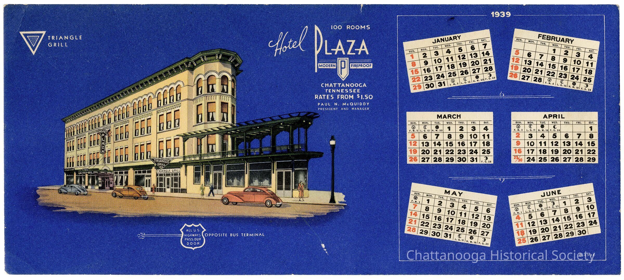 Advertising blotter for the Hotel Plaza. The blue blotter card features a 1939 January through June calendar. The left-center of the card features a drawing of the building that sits at 1012 Market Street that held both the hotel and the Triangle Grill.Collection