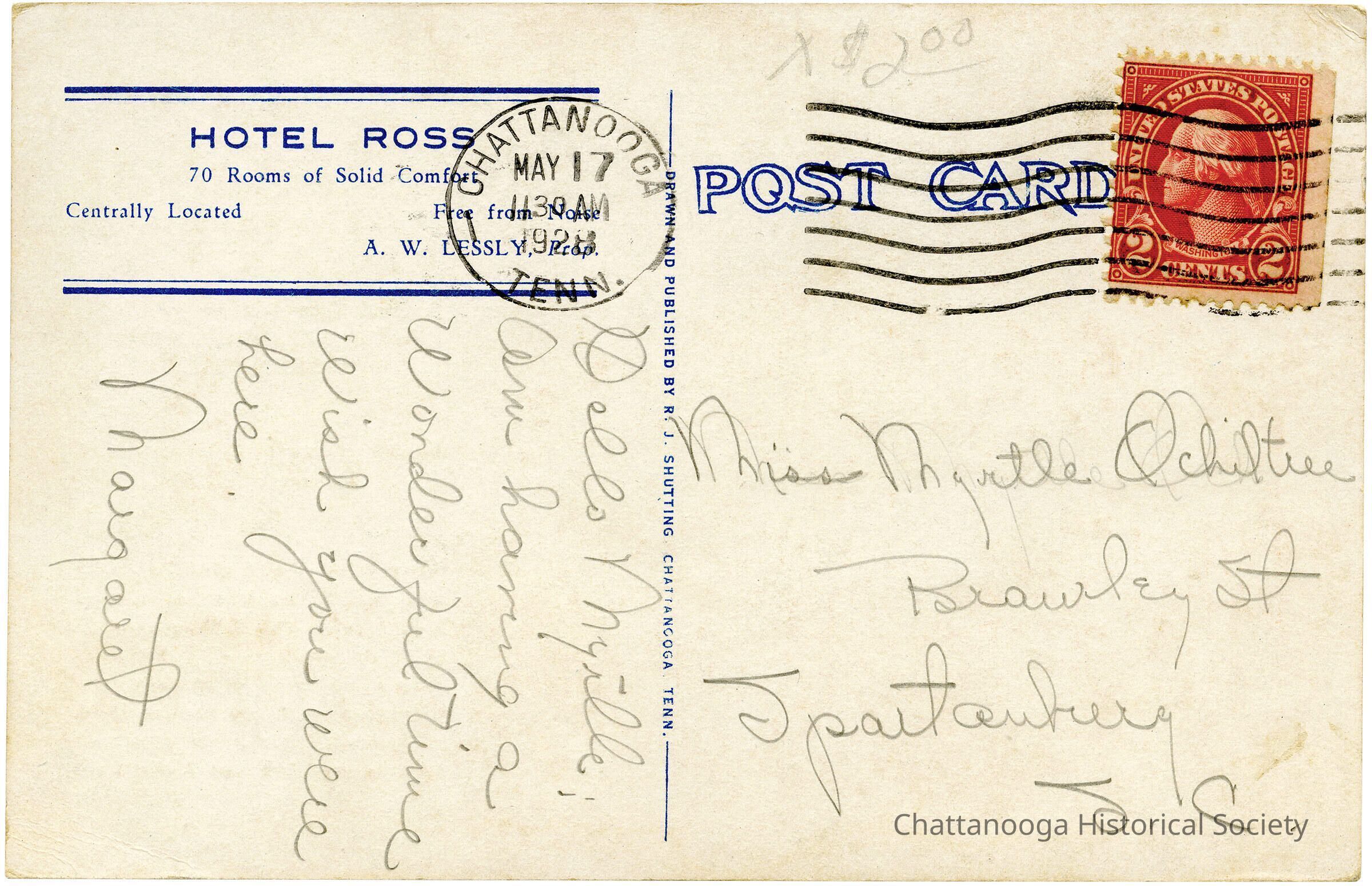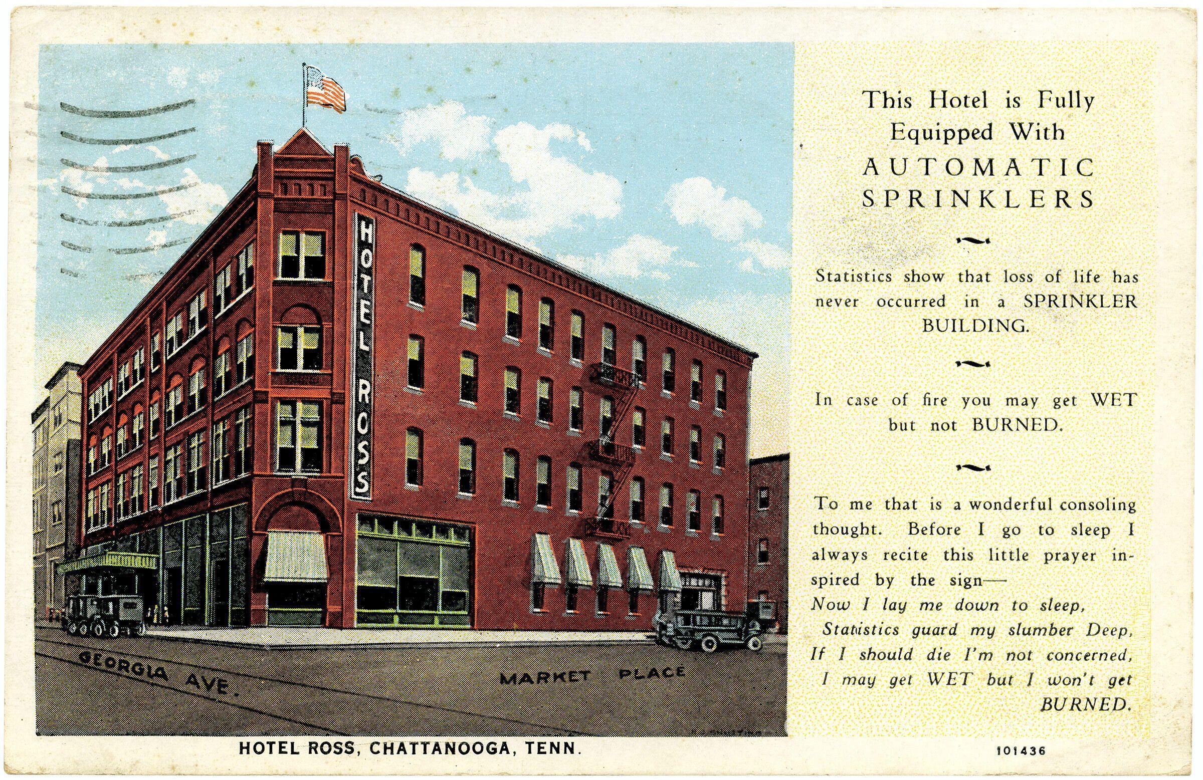 An advertising postcard with the front showing a photograph of the Hotel Ross, located at the corner of Georgia Avenue and Market Square (Patten Parkway).