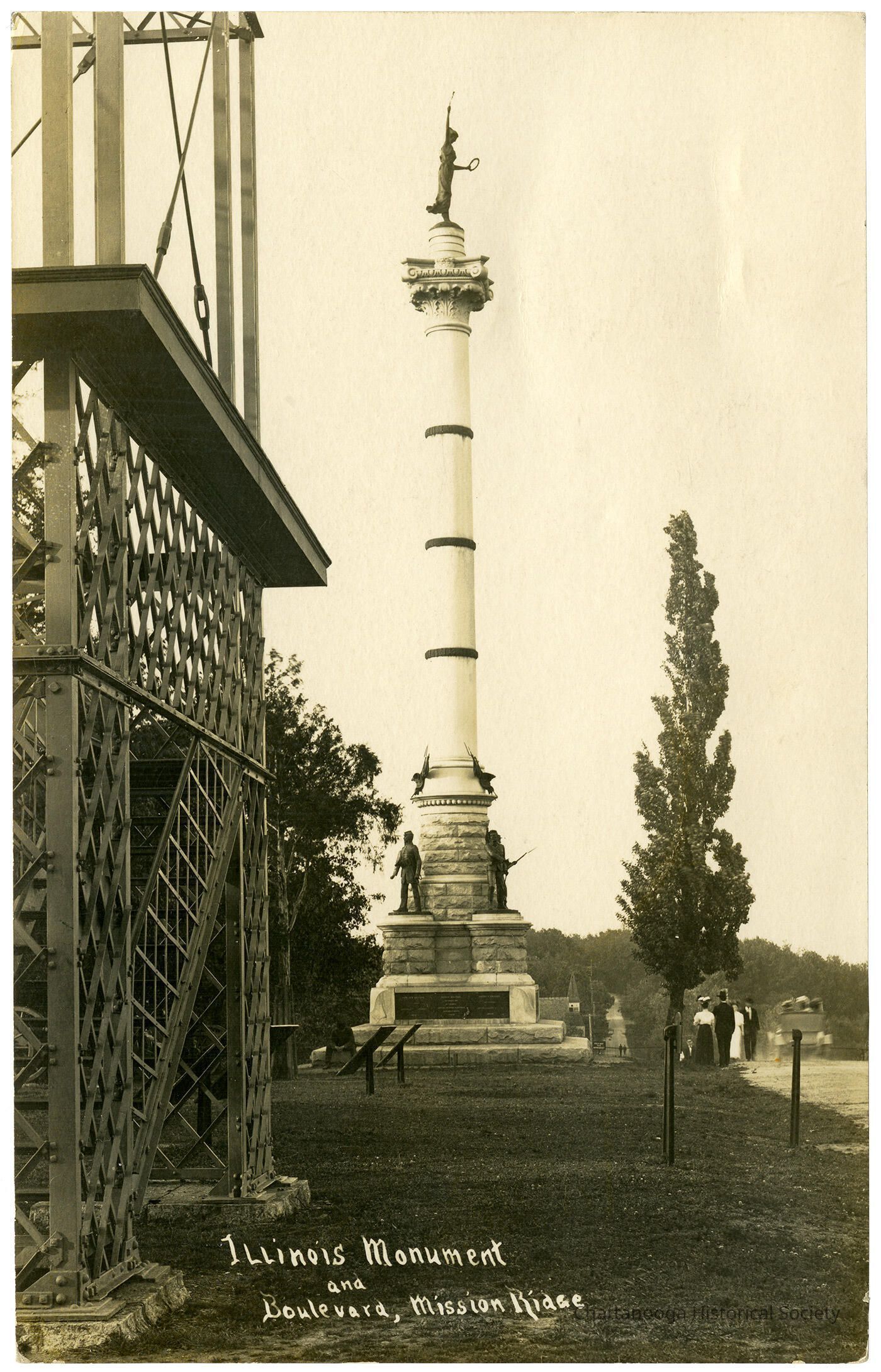 A photographic postcard with the front showing the Illinois Monument and a nearby observation tower at Bragg's Reservation on Missionary Ridge. Two men and two women stand off the boulevard while a touring car passes them by. Bragg's Tower is in the left foreground