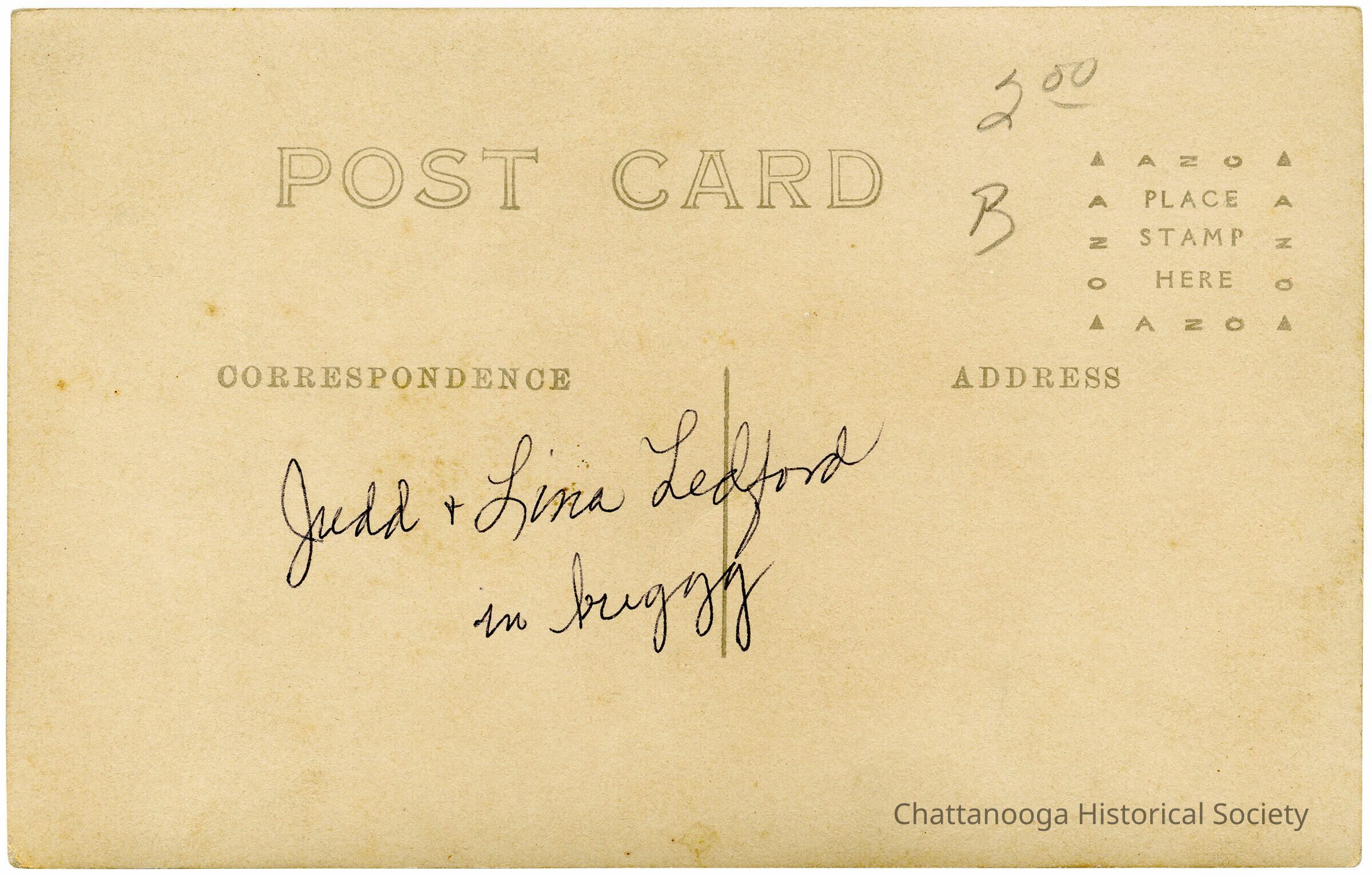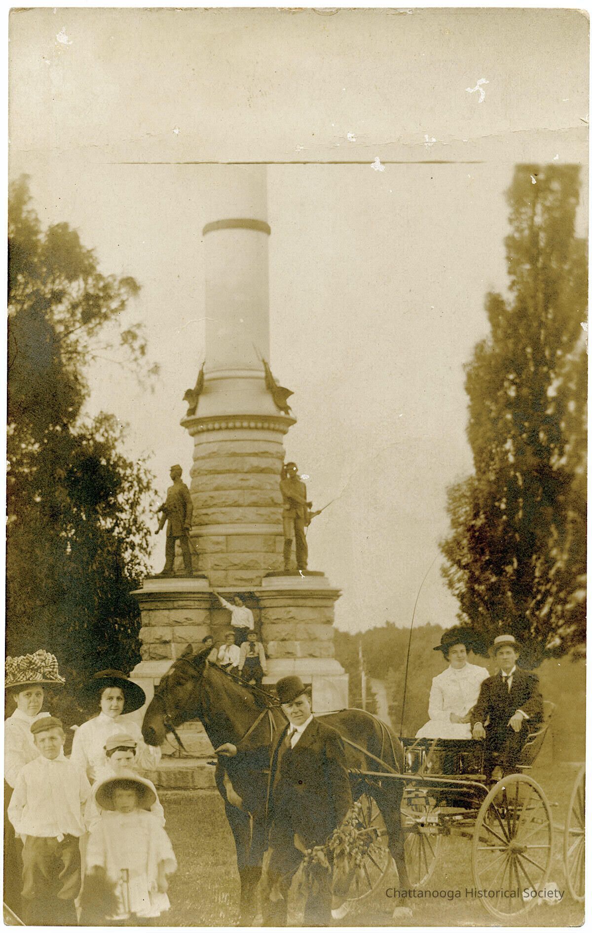 A gelatin-silver printed postcard with the front showing a photograph of a group posing in front of the Illinois Monument on Missionary Ridge. The couple sitting in a horse-drawn buggy are identified on the reverse as Judd and Lina Ledford.