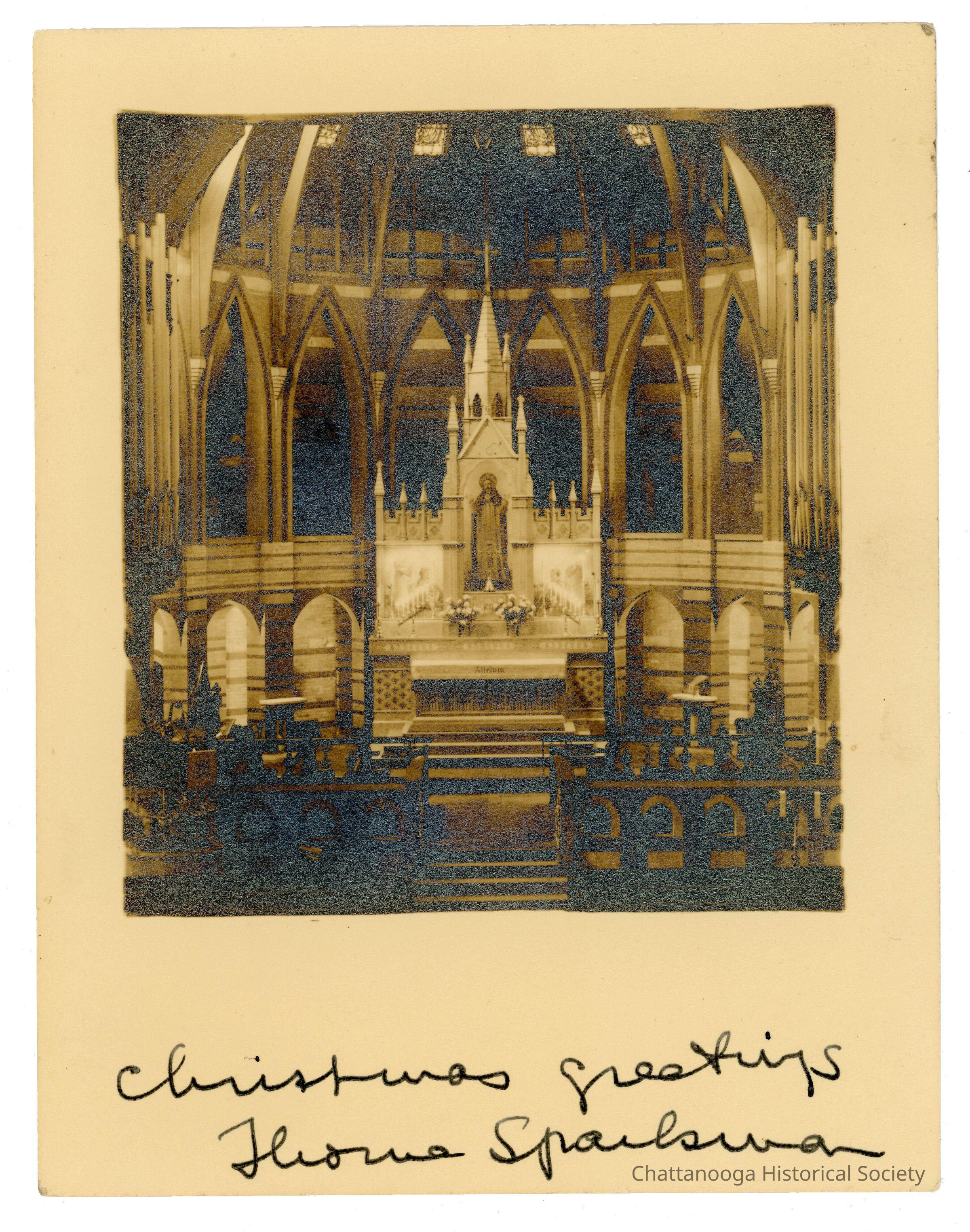 Photograph of the interior of St. Paul's Church in Downtown Chattanooga, Tennessee. The photograph shows the apse of the church with a pipe organ as well as an altar in the center displaying Jesus Christ.