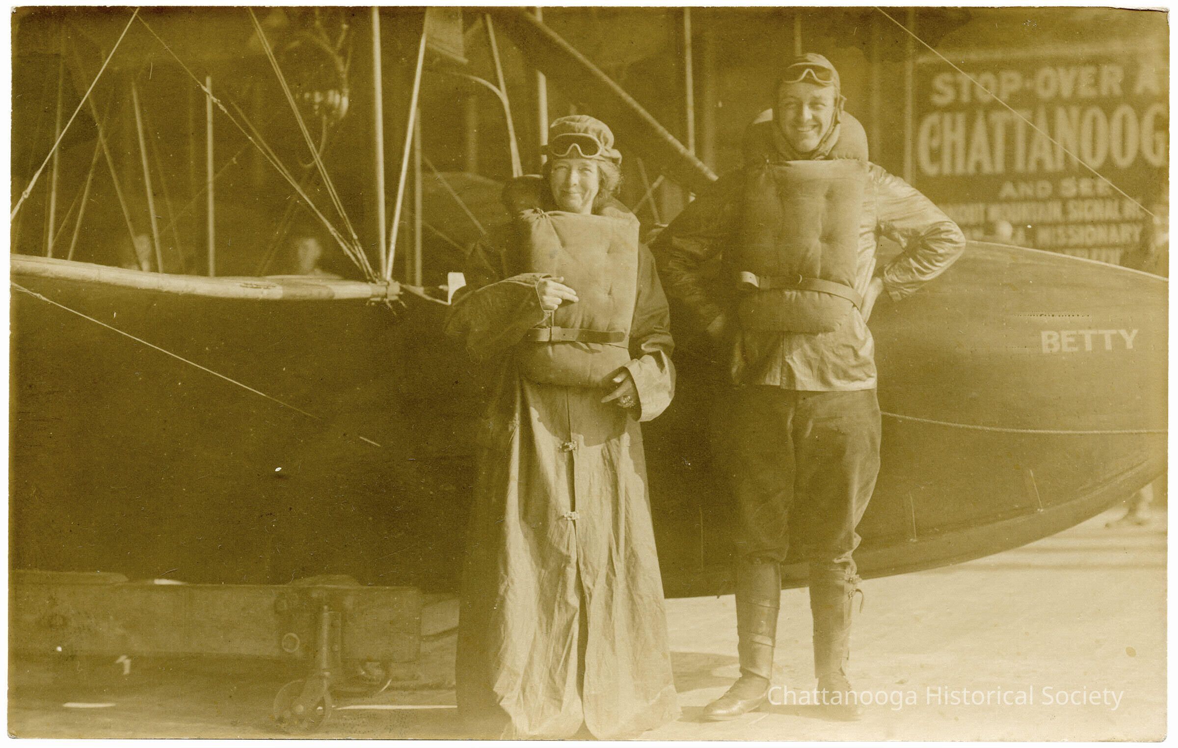 A postcard with the front showing a photograph of Johnny Green, an early aviator in Chattanooga with an unidentified woman. They are standing next to his Curtiss Gull biplane, "Betty" (named for his wife). Mr. Green is wearing a period flight suit, including a cap, goggles, jacket, knickerbockers, wrapped boots, and a life jacket. The woman is wearing a cap, goggles, a floor-length duster, and a life jacket.