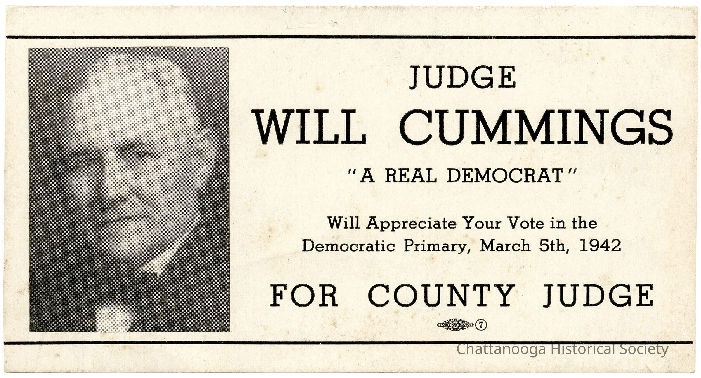 The blotter reads "Judge Will Cummings "A Real Democrat" Will Appreciate Your Vote in the Democratic Primary, March 5th, 1942 Fort County Judge"Collection
