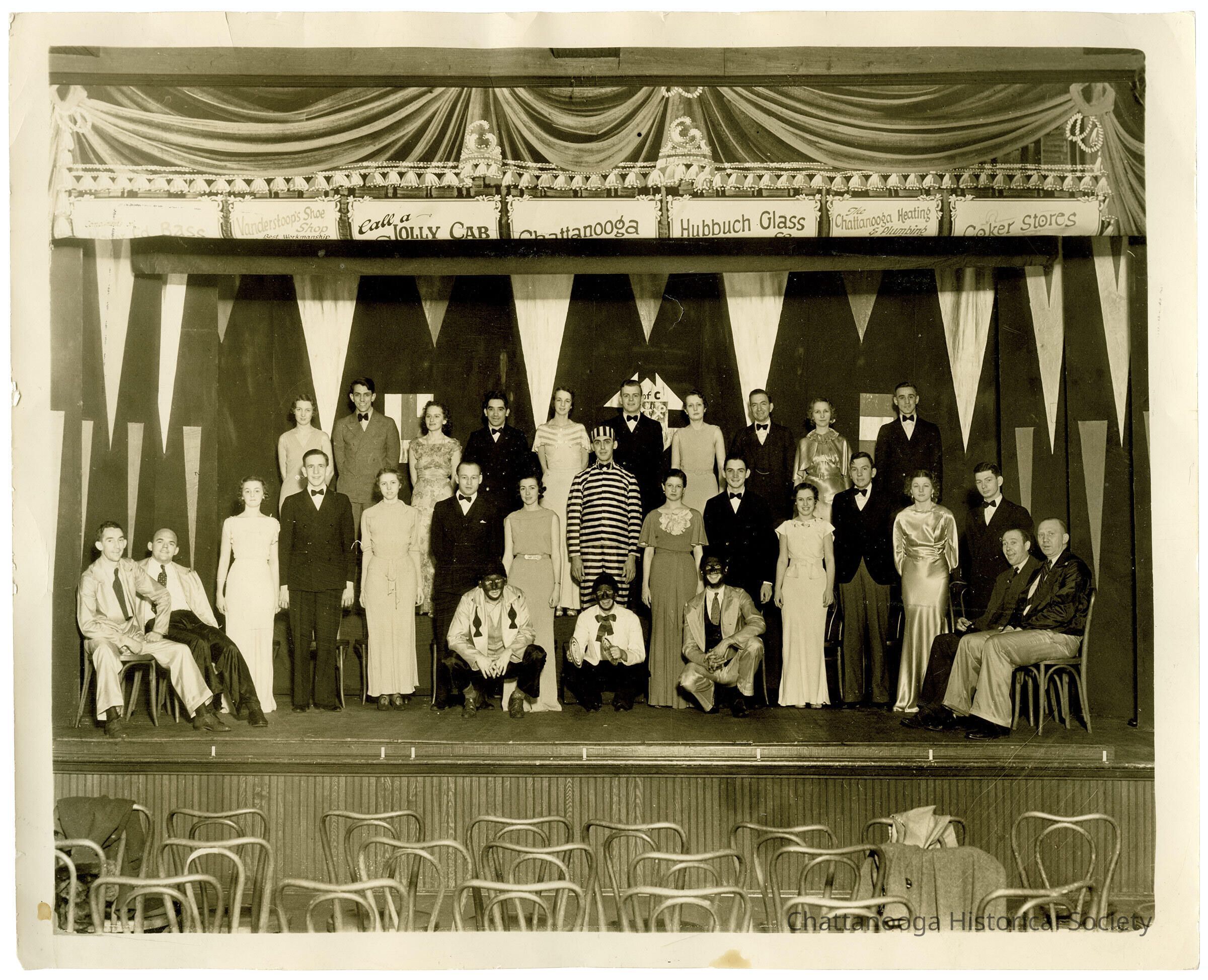 A photograph showing the cast of a Knights of Columbus minstrel show, dated February 14 and 15, 1935. The cast is arranged on a theater stage that advertises various businesses. There are three men in blackface in the front row, kneeling down.