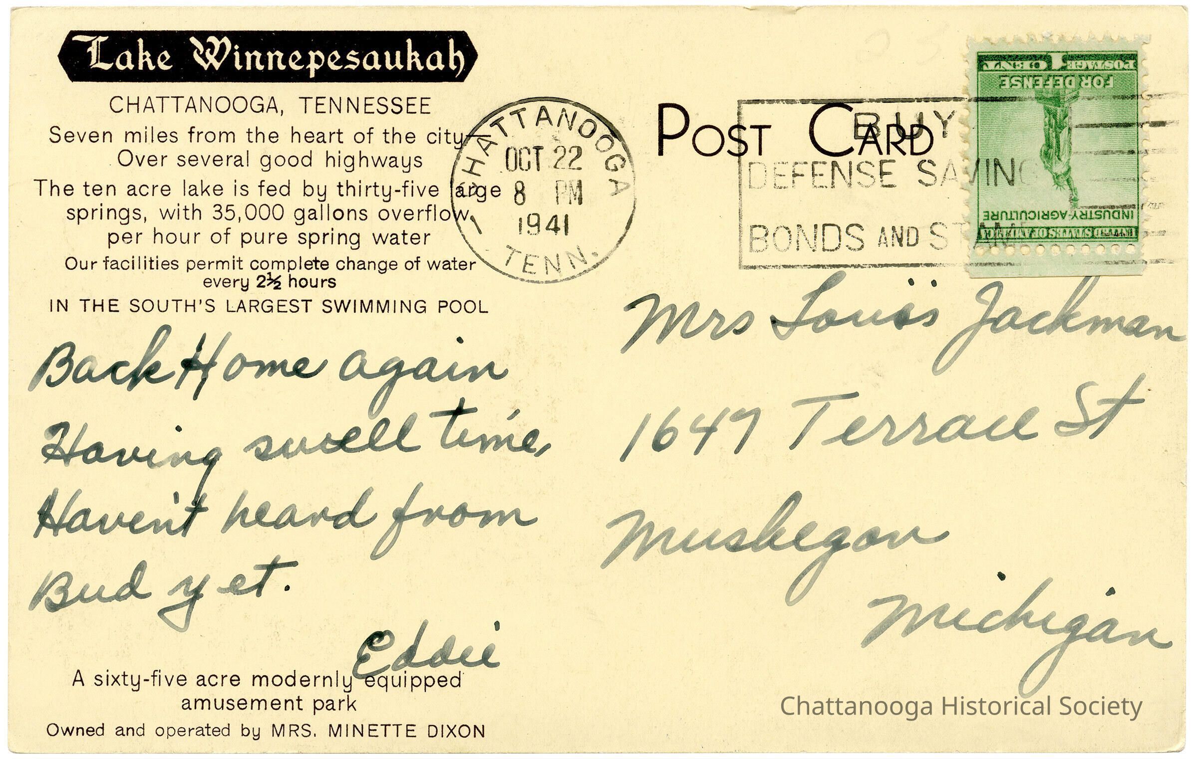 The advertisement on the rear reads "Lake Winnepesaukah, CHATTANOOGA, TENNESSEE Seven miles from the heart of the city—Over several good highways The ten acre lake is fed by thirty-five large springs, with 35,000 gallons overflow per hour of pure spring water Our facilities permit complete change of the water every 2 1/2 hours IN THE SOUTH'S LARGEST SWIMMING POOL