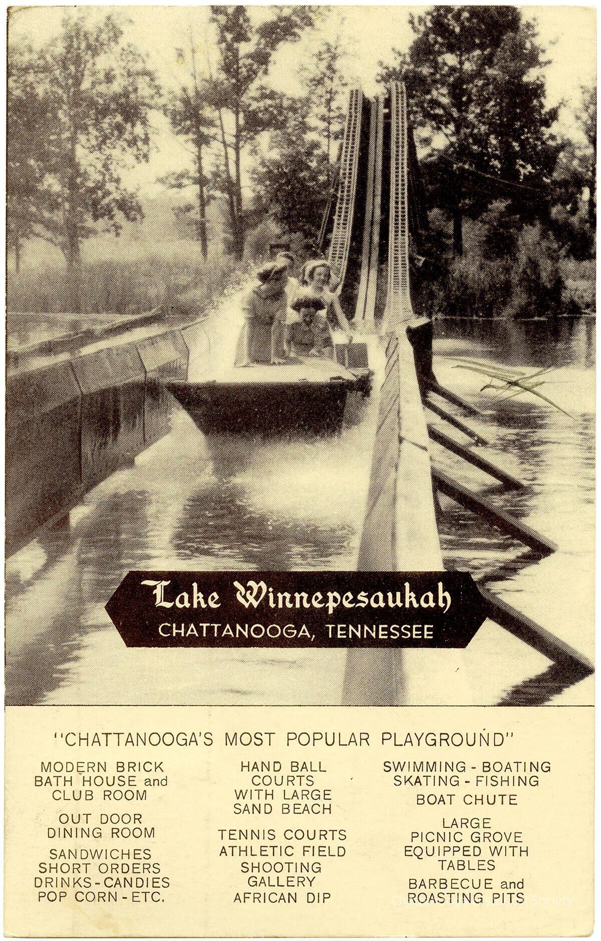 The bottom of the postcard describes Lake Winnepesaukah's many assets: "CHATTANOOGA'S MOST POPULAR PLAYGROUND"