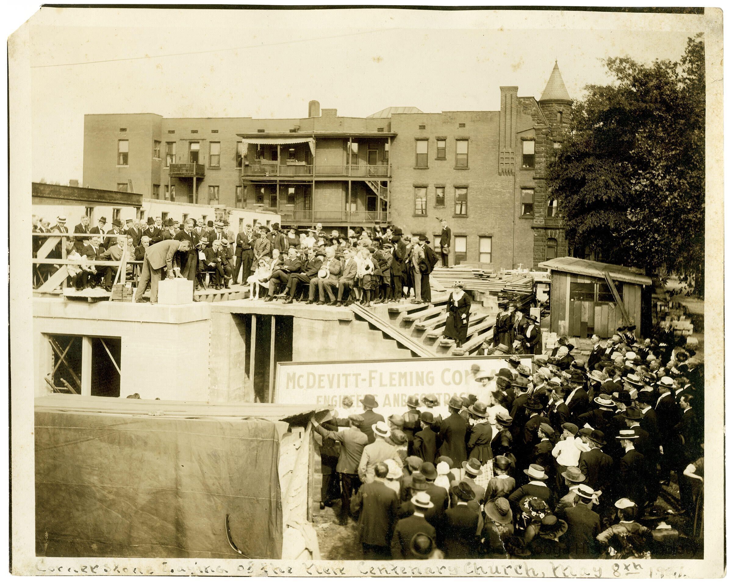 A photograph showing the laying of the cornerstone ceremony of the Centenary Church in May of 1921. A sign in the mid-ground proclaims the engineers and contractors as McDevitt-Fleming Company.