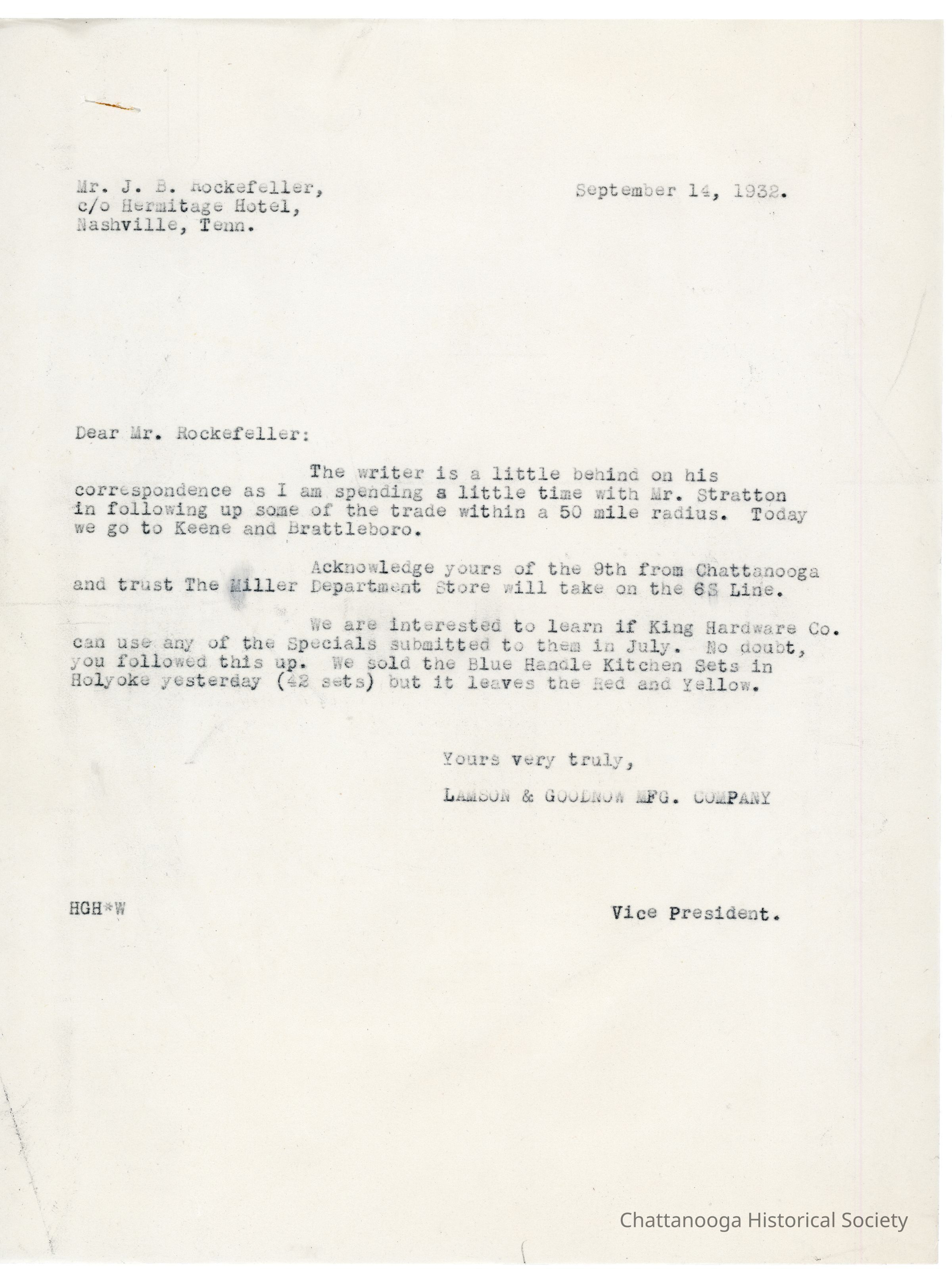 A letter written from Lamson & Goodnow Manufacturing Company written to their representative J.B. Rockefeller. The letter is typed on plain paper in response to letter 2022.104.001. The letter reads