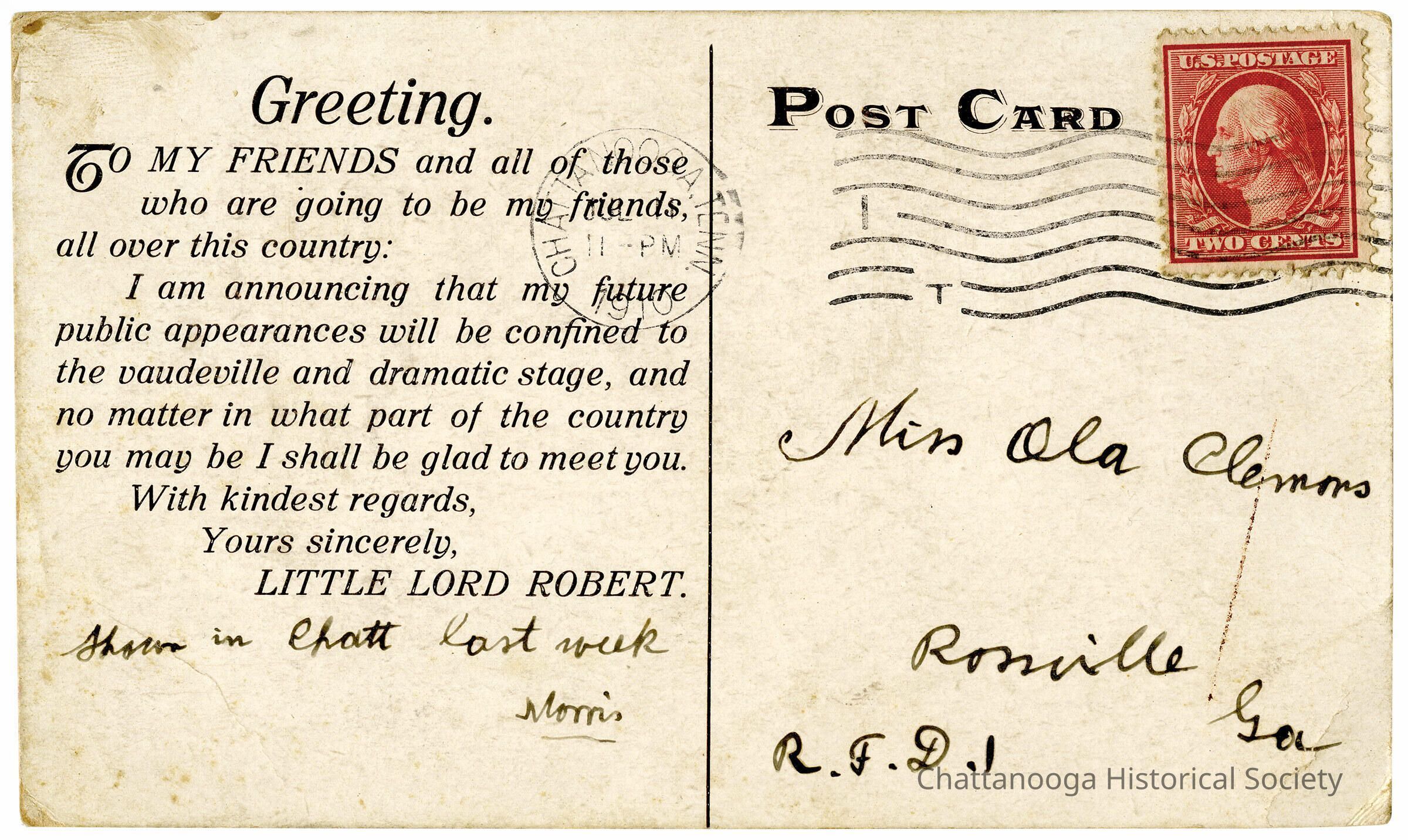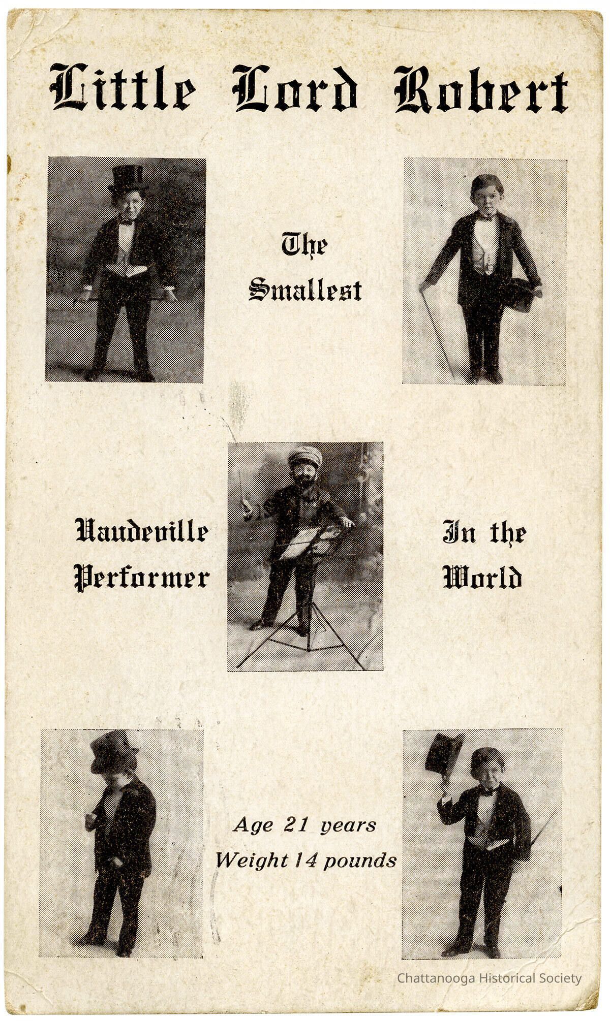 A postcard with the front showing an advertisement for Little Lord Robert, a vaudeville performer. The front of the card reads "Little Lord Robert, The Smallest Vaudeville Performer In the World Age 21 years, Weight 14 pounds"