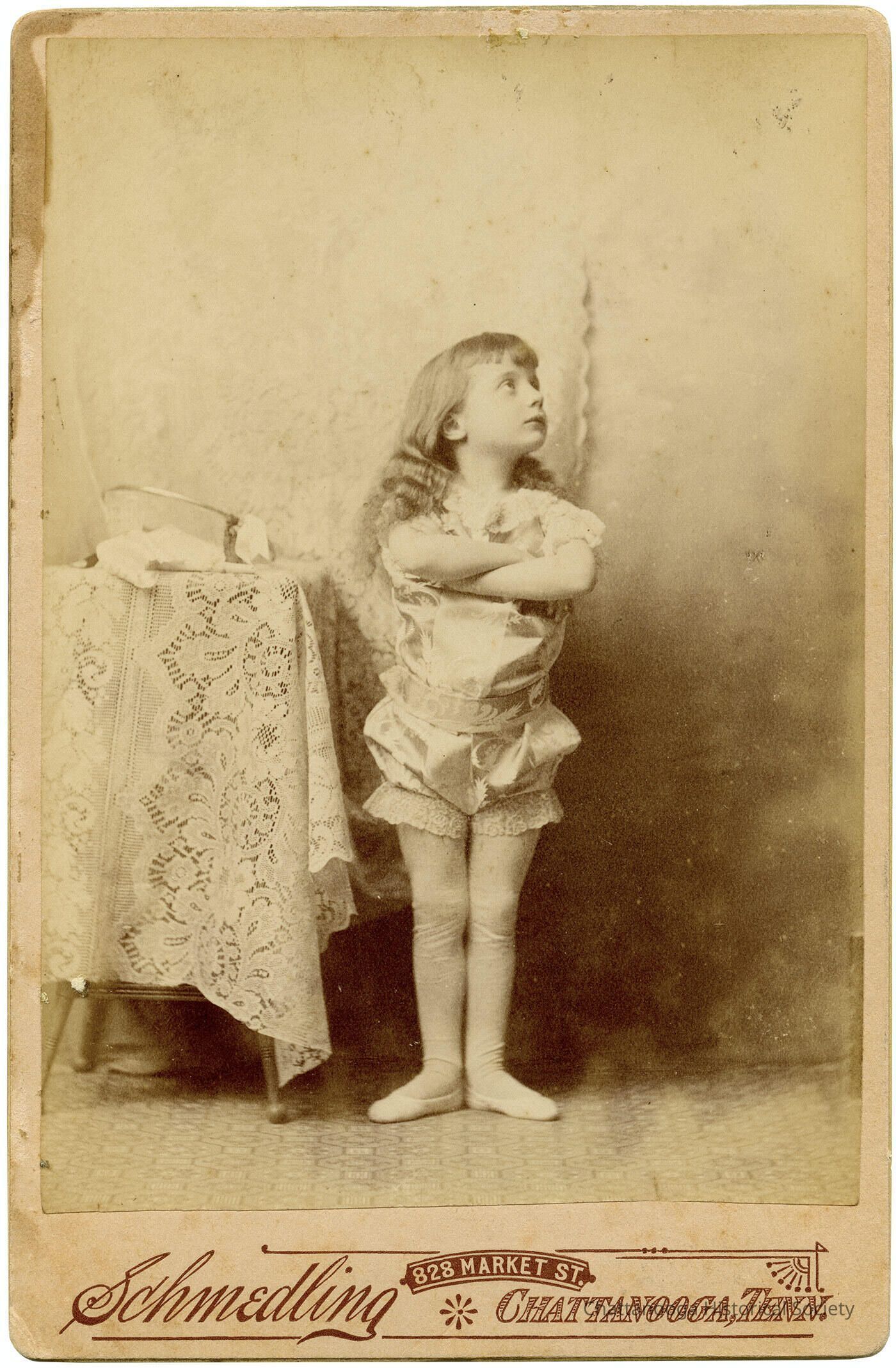 A black and white photograph mounted on a cabinet card showing Little Tillie Showers, the World's Smallest Contortionist. The photograph shows the young girl wearing a pair of white ballet flats and tights and with a white bloomer and blouse. Her arms are crossed across her chest and she is looking up to the top right corner of the photograph. She is standing in front of a studio backdrop with a lace covered table beside her. The gutter of the card is marked "Schmedling 828 Market St. Chattanooga, Tenn." The rear reads "Little Tillie Showers Smallest Living Contortionist" in ink.