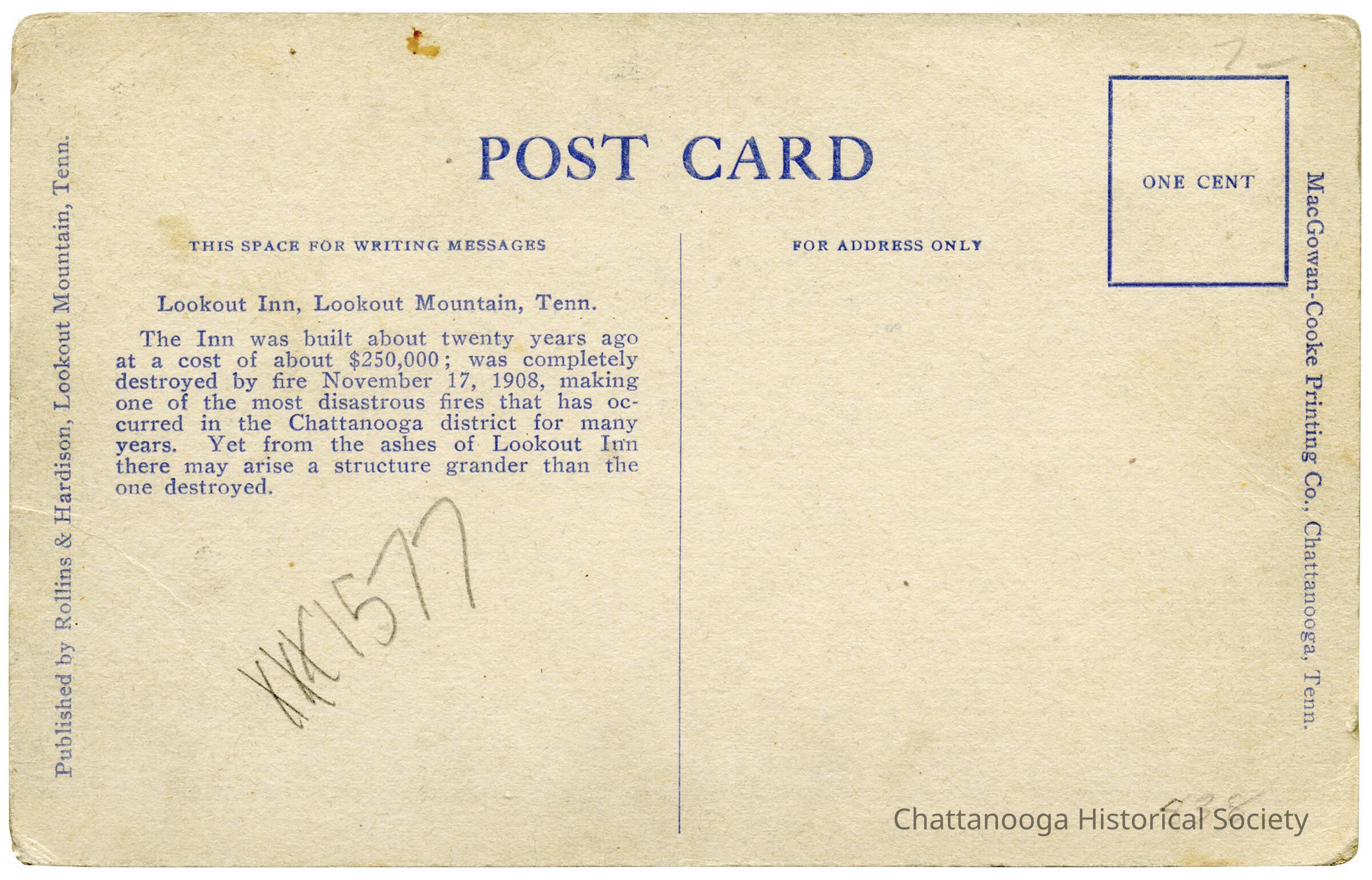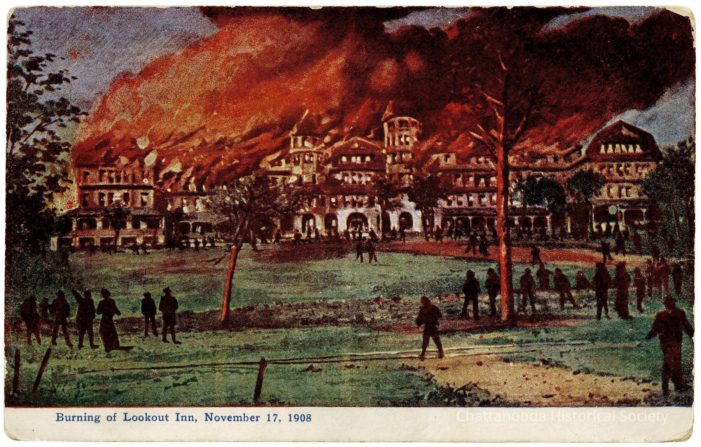 The inscription on the Verso reads "The Inn was built about twenty years ago at a cost of about $250,000; was completely destroyed by fire November 17, 1908, making one of the most disastrous fires that has occurred in the Chattanooga district for many years. Yet from the ashes of Lookout Inn there may arise a structure grander than the one destroyed."