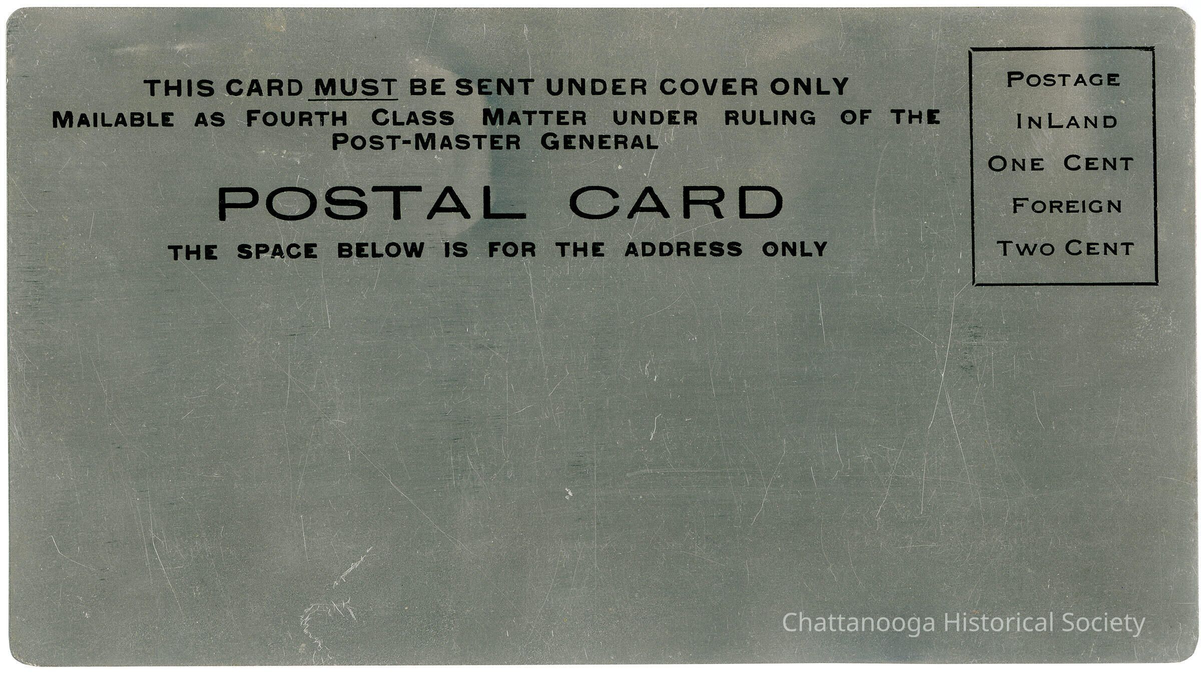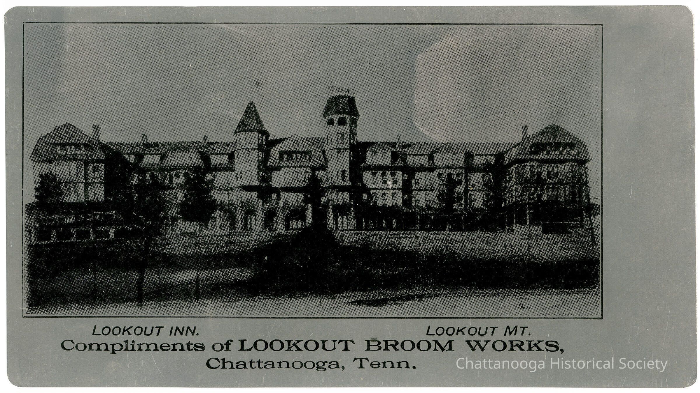 An aluminum postcard with the front showing a photograph of Lookout Inn on Lookout Mountain. "Compliments of Lookout Broom Works, Chattanooga Tenn." The postcard shows an image of the front façade of the hotel on the front in a black outlined box. "Lookout Inn. Lookout Mt., Compliments of Lookout Broom Works, Chattanooga, Tenn." is printed in the gutter. Since the postcard card had to be mailed in a plastic cover, the rear is printed "This card MUST be sent under cover only Mailable as Fourth Class Matter Under Ruling of the Post-Master General".