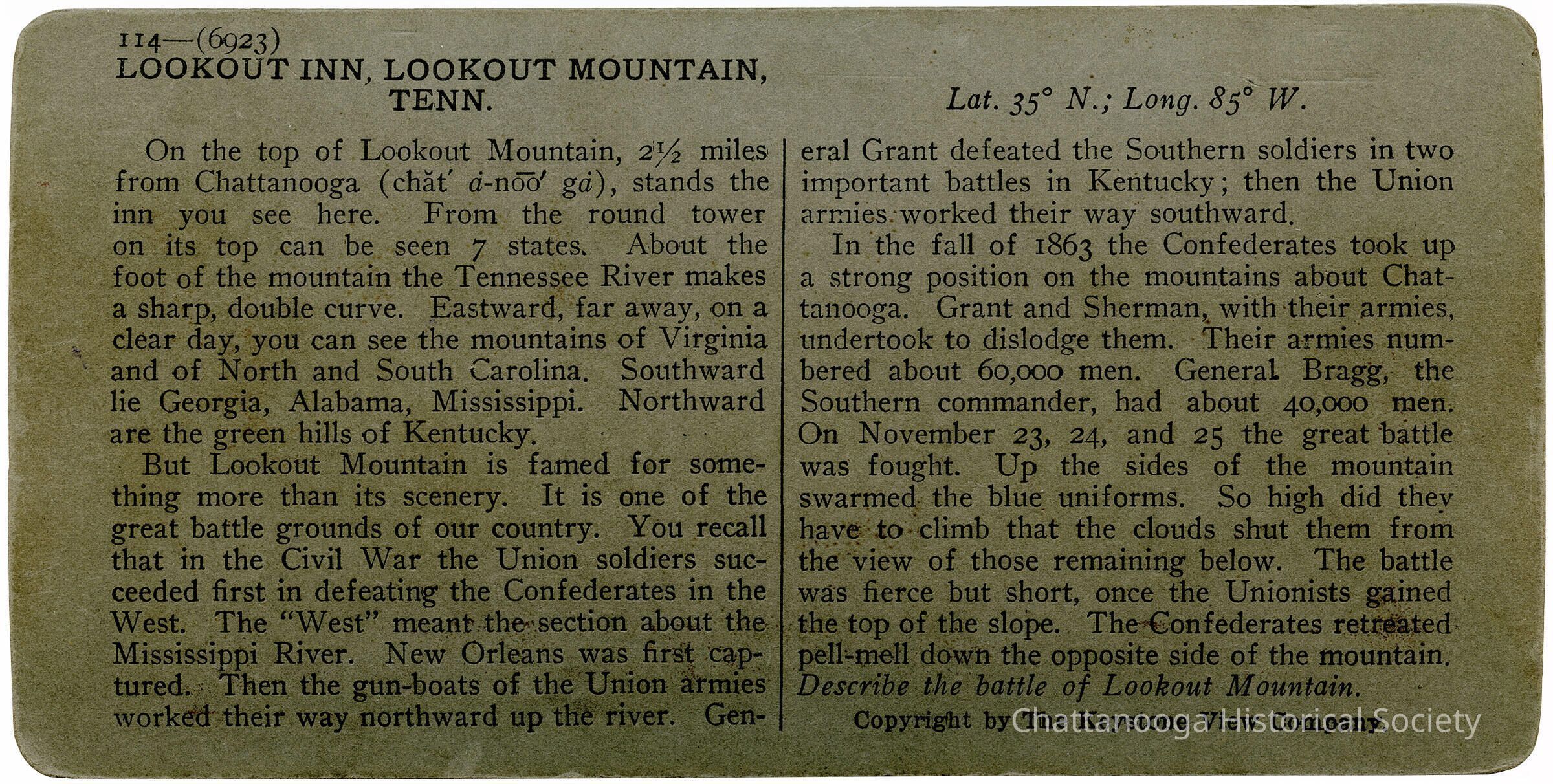 On the top of Lookout Mountain, 2 1/2 miles from Chattanooga (chat' a-noo ga), stands the inn you see here. From the round tower on its top can be seen 7 states. About the foot of the mountain the Tennessee River makes a sharp, double curve. Eastward, far away, on a clear day, you can see the mountains of Virginia and of North and South Carolina. Southward lie Georgia, Alabama, Mississippi. Northward are the green hills of Kentucky.
