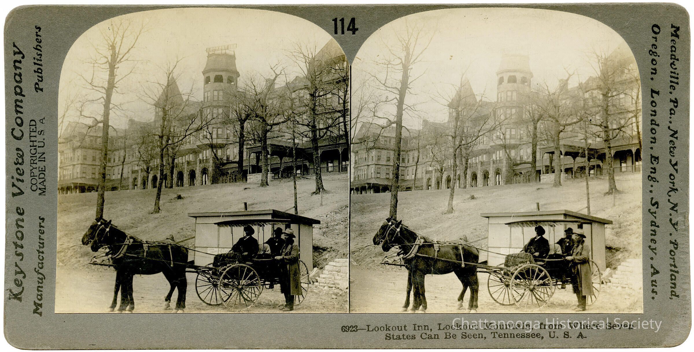 The stereograph is titled "6923-Lookout Inn, Lookout Mountain, from Where Seven States Can Be Seen, Tennessee, U.S.A." at the bottom right of the card. "Keystone View Company, Manufacturers, Copyrighted Made in U.S.A., Publisher" is printed on left gutter and "Meadville, Pa., New York, N.Y. Portland, Oregon, London, Eng., Sydney, Aus." on the right gutter. The card is also numbered 114 at the top, center.