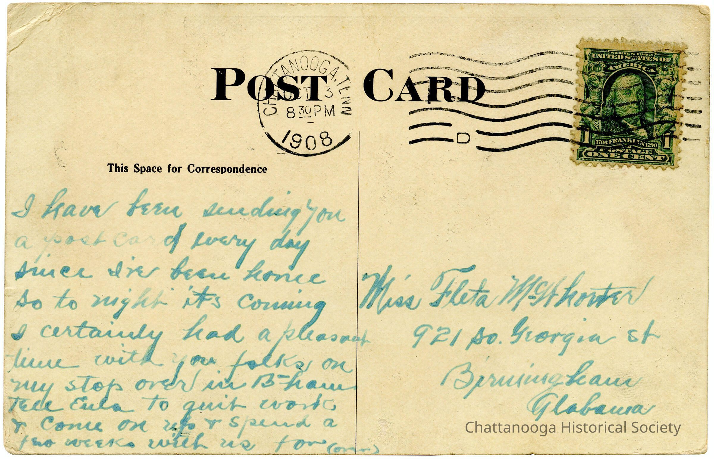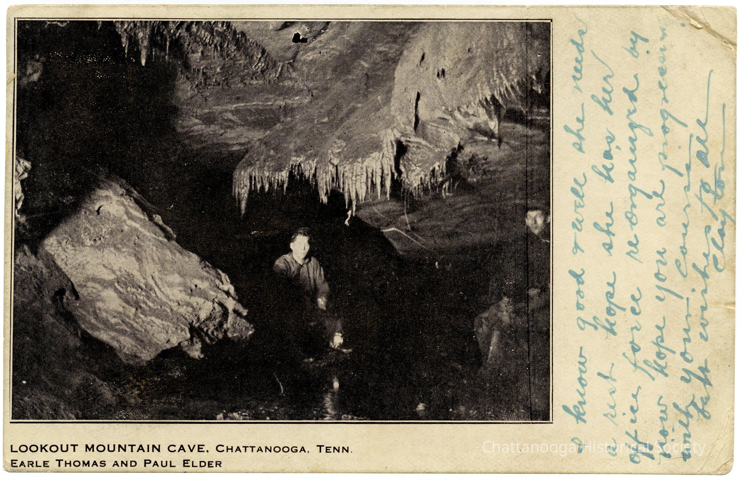 A postcard with the front showing a photograph of two men. They are identified as Earle Thomas and Paul Elder and are shown caving in the Lookout Mountain Cave, Chattanooga, Tennessee.Subject Person/Organization