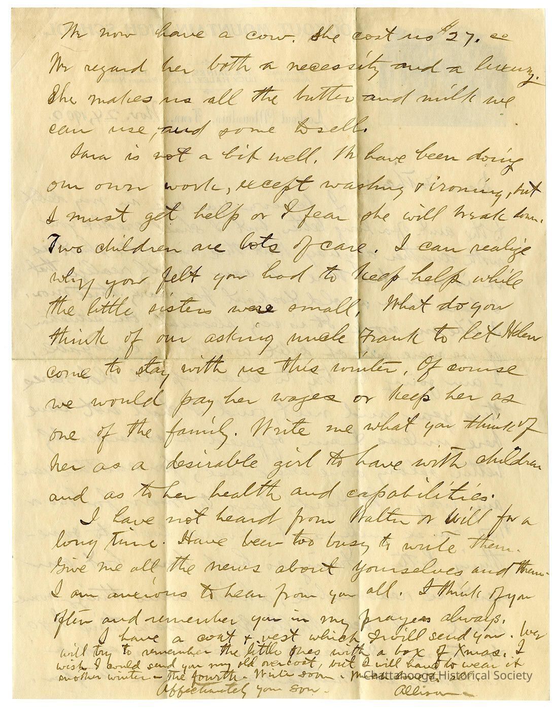 The letter is to their father about their position at the school and the high cost of living, but the low cost of rent in the area. They also talk about purchasing a cow for the family, the difficulties of raising children, and hopes of receiving assistance from the family.Archive Items Details