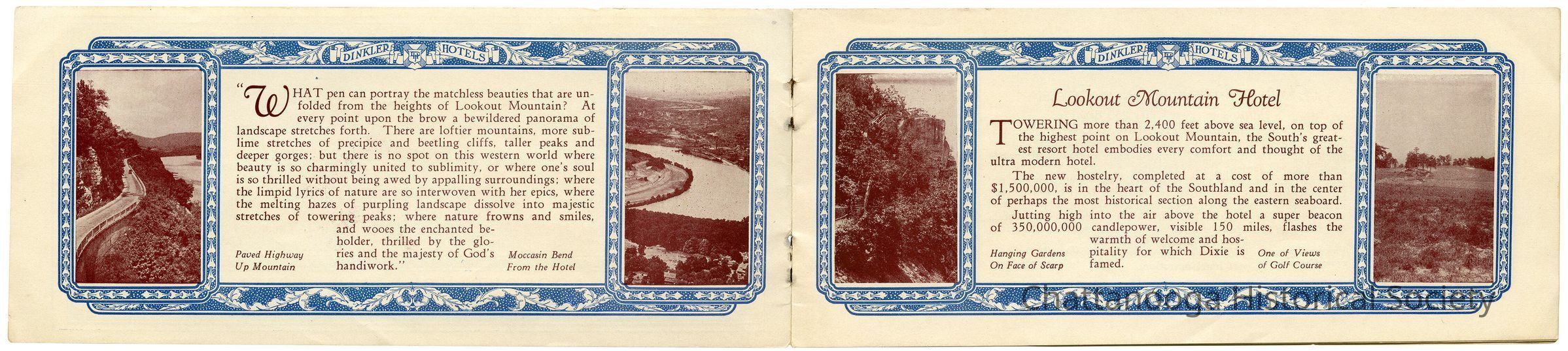 Small photographs of the highway leading up Lookout Mountain and the Moccasin Bend of the Tennessee River are seen on the interior pages. In describing the hotel, it it noted that it had recently been completed at a cost of $1.5 million, and features a "super beacon" above the hotel visible from a distance of 150 miles.Relationships