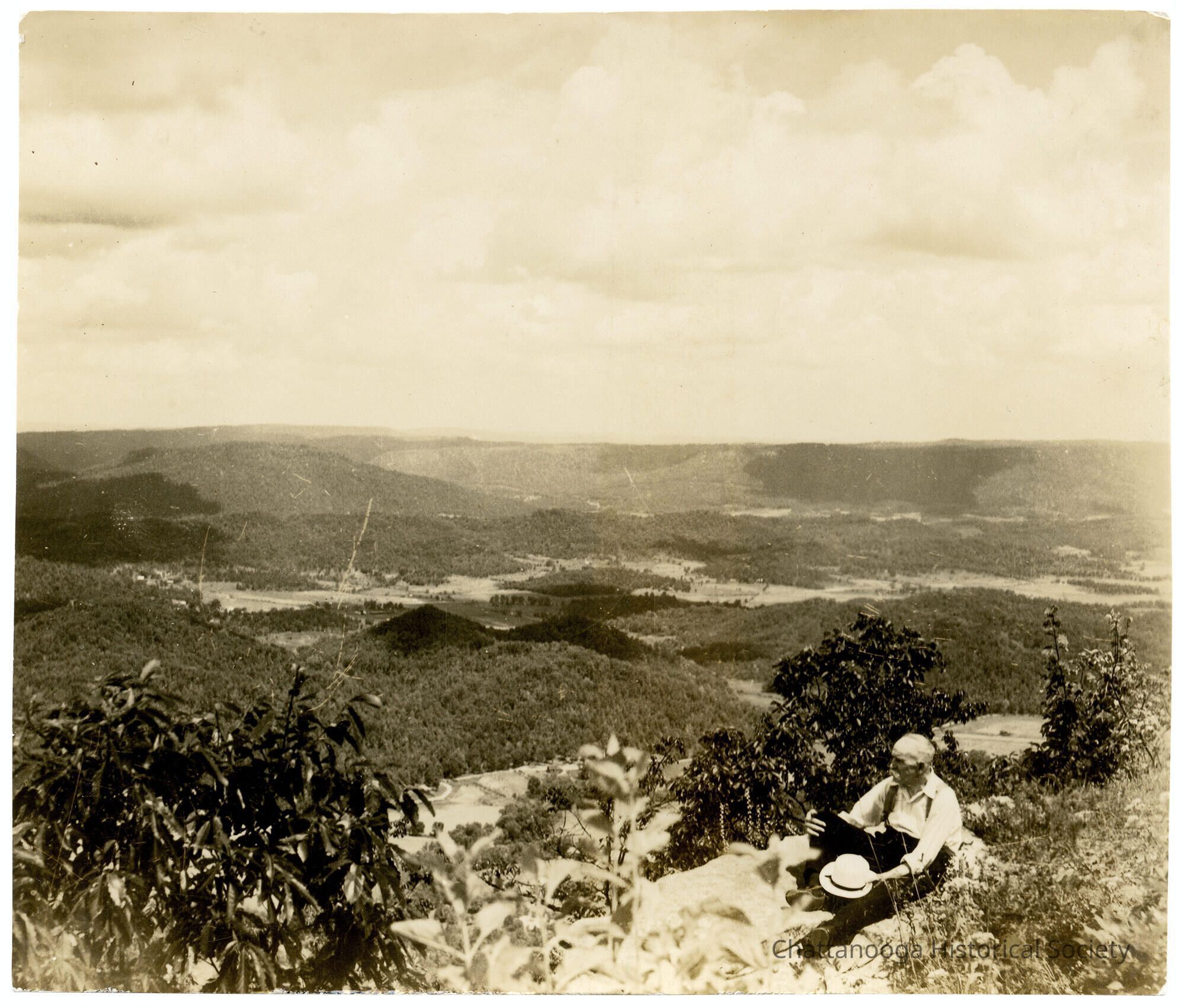 A black and white photograph showing man sitting on the edge of Lookout Mountain overlooking Dade County, Georgia. The man is wearing a white dress shirt with dark pants and a flat topped hat. He is sitting on the rock edge, overlooking the valley below.