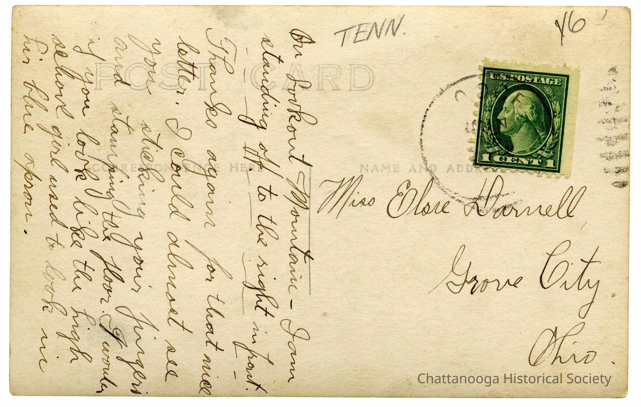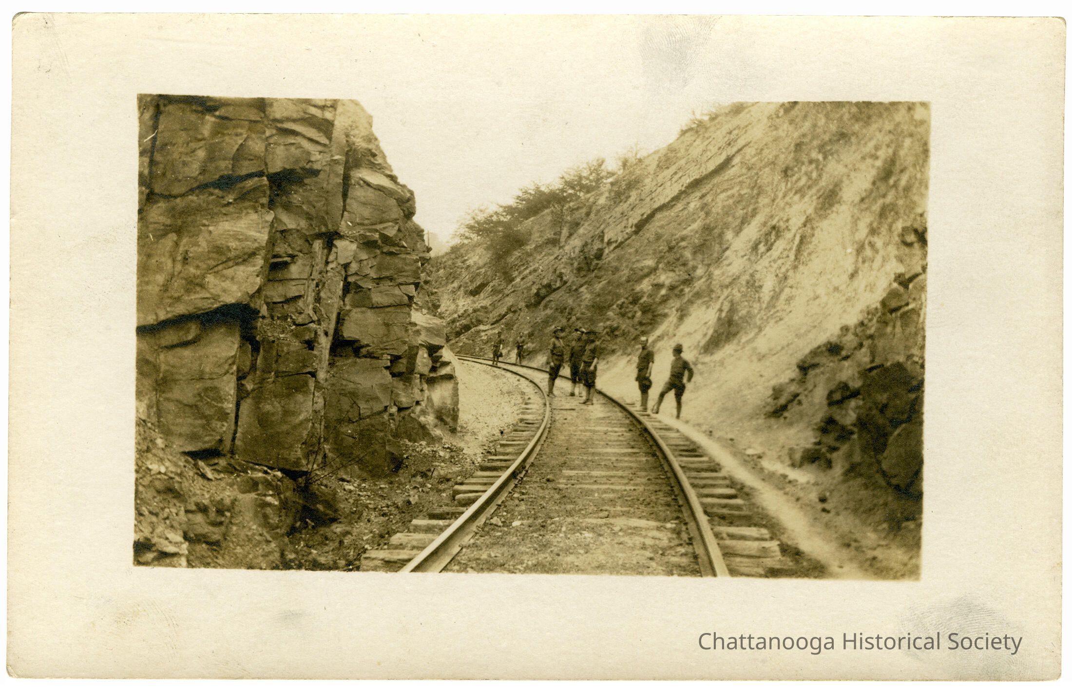 A gelatin-silver printed postcard with the front showing soldiers standing on the old Durham Railroad tracks near Lula Lake on Lookout Mountain, Georgia. The men are wearing World War 1 era uniformsSubject Place