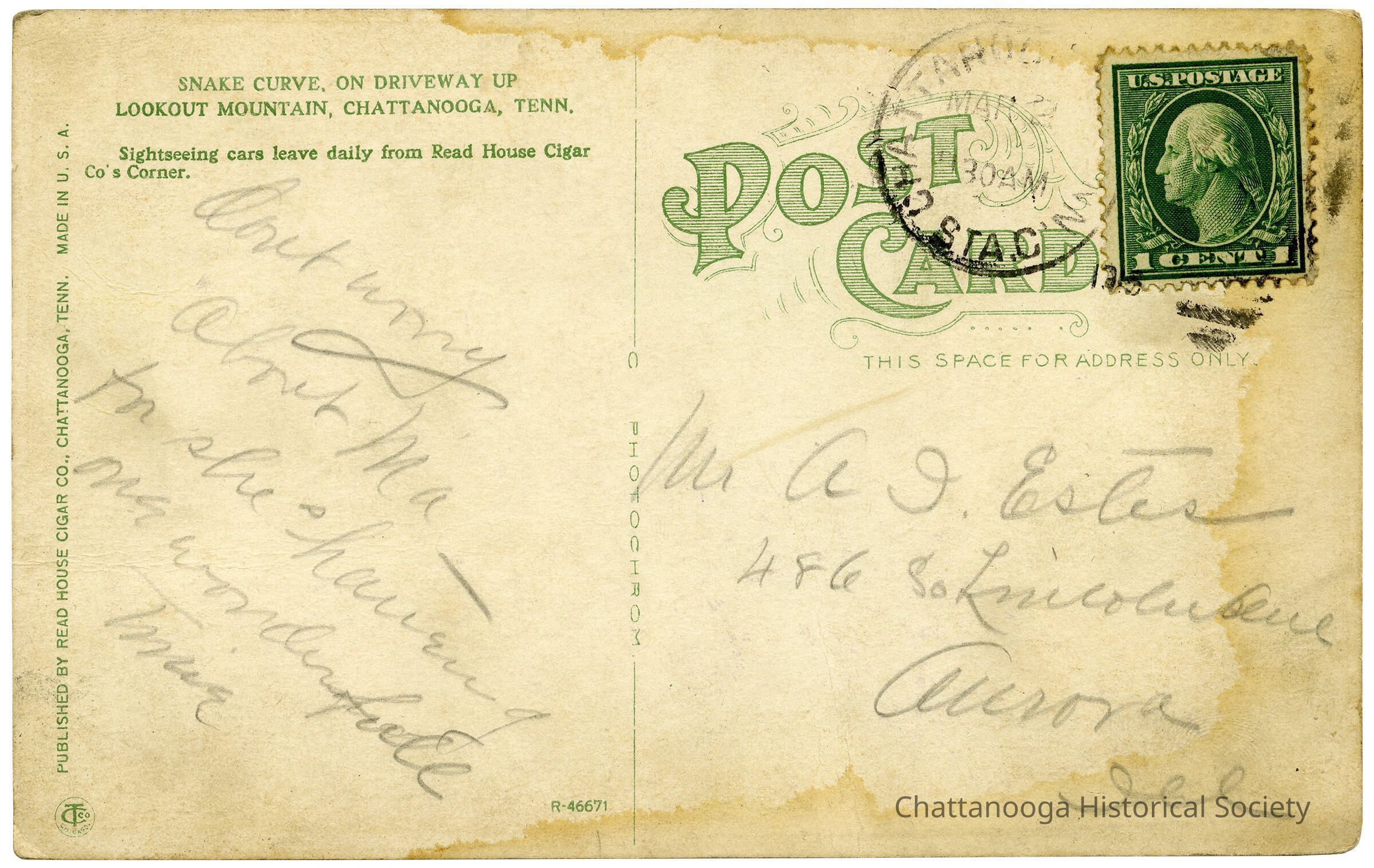Rear reads "SNAKE CURVE ON DRIVEWAY UP LOOKOUT MOUNTAIN, CHATTANOOGA, TENN. Sightseeing cars leave daily from the Read House Cigar Co.'s corner."
