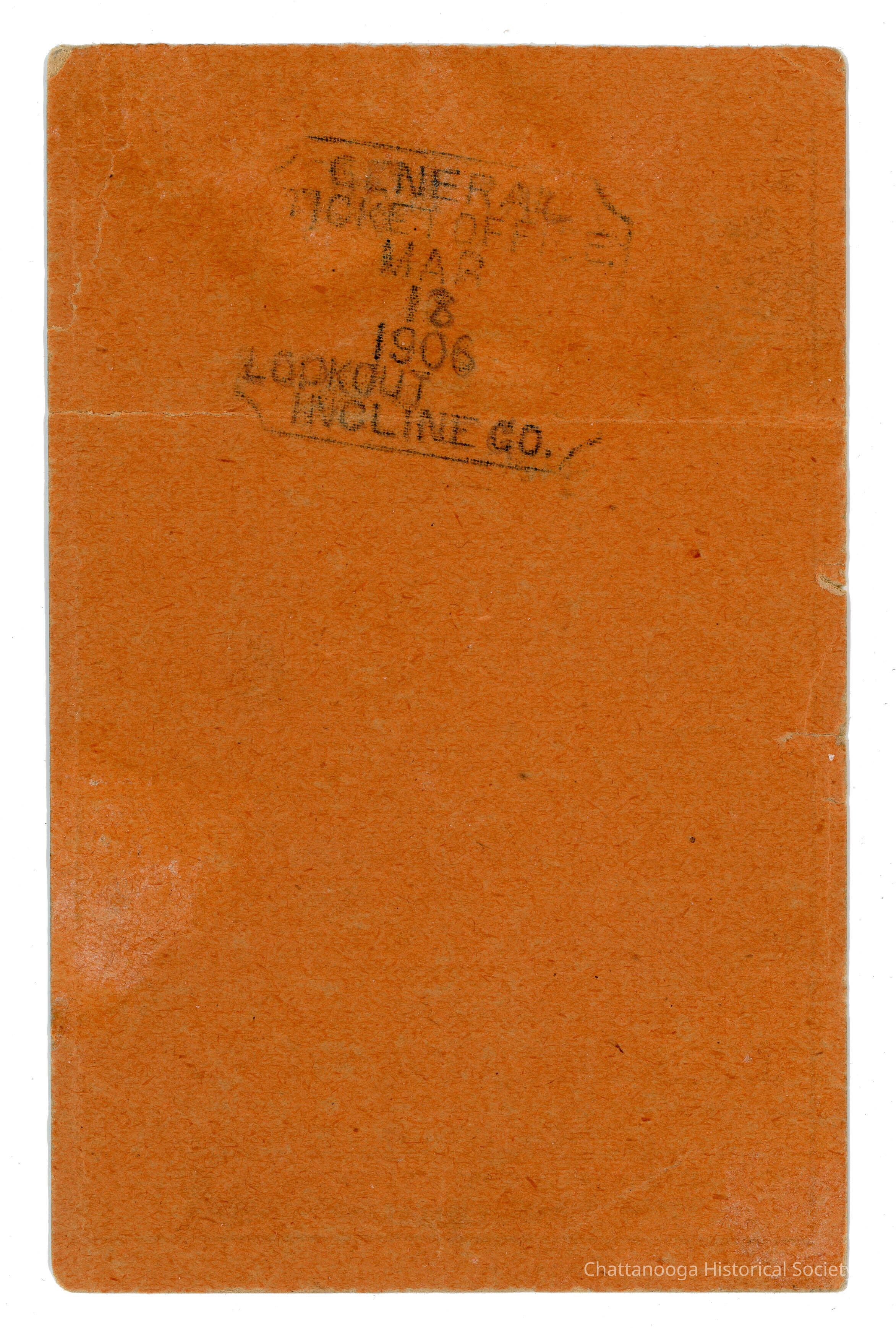 An excursion ticket from the Chattanooga and Lookout Mountain Railway for admittance on the Incline Railway No. 2. This is a Sunday ticket that was sold at a reduced rate and is stamped on the rear "General Ticket Office | Mar | 18 | 1906 | Lookout | Incline Co." on the burnt orange colored ticket.