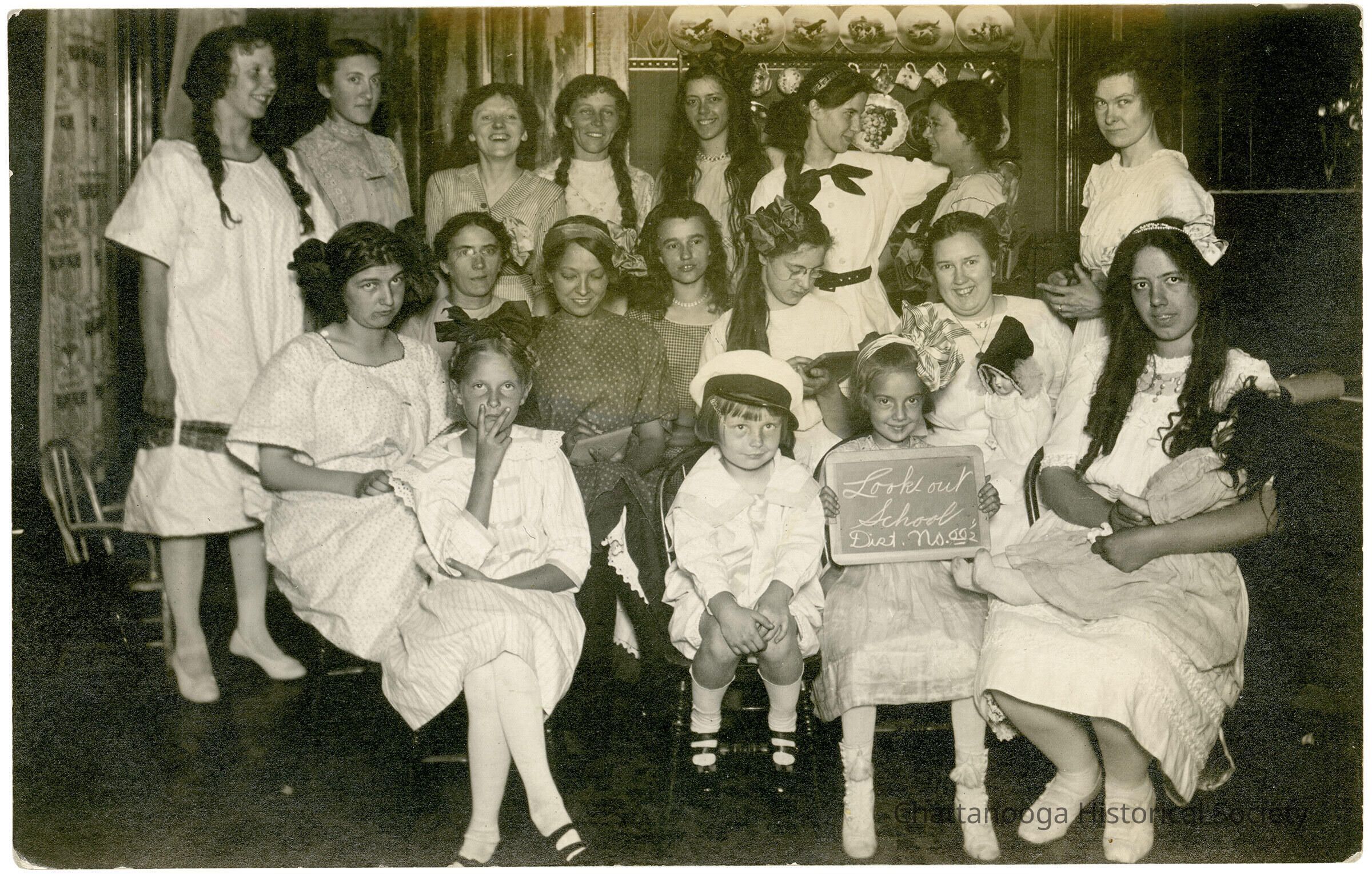 A postcard with the front showing a photograph of a group of seventeen school children and their teacher. A girl in the front row holds up a slate board with "Lookout School, Dist. No. 001/2".