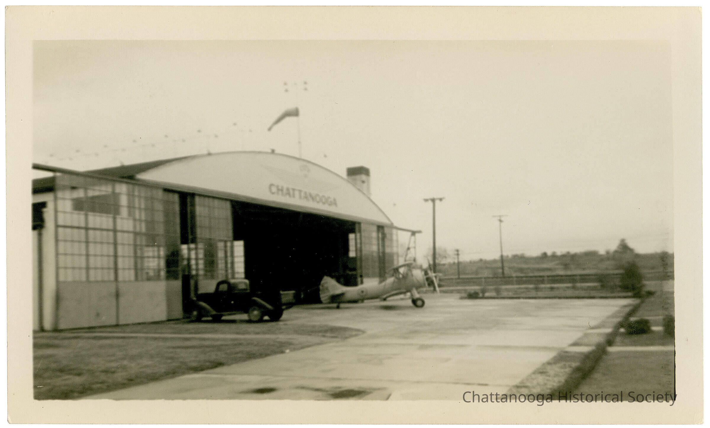Black and white photograph of the Lovell Field hanger with a biplane sitting out front. The hanger doors are open and a dark truck is parked to the left of the plane. The photograph shows the details of the airport apron with a short hedgerow running parallel to the concrete road. The hanger shows the windsock at the top of the roof of the hanger. This hanger was the first one constructed on the field. TheDate(s) of Creation