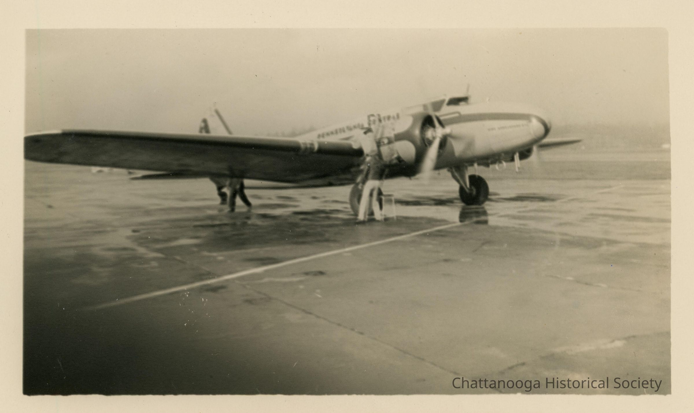Black and white photograph of men accessing the cabin door of a Pennsylvania Central Airlines 247. The planes' propellers are in motion and two men appear to be servicing one of the engines. PCA only flew at the Chattanooga Airport from February 15 - March 31, 1941Date(s) of Creation
