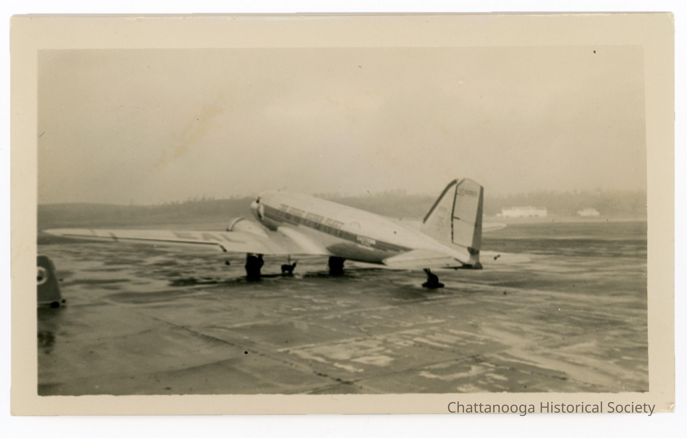 Black and white photograph of Eastern Airlines Douglas DC-3 NC25648 on the Lovell Field Ramp. The plane's nose is pointed away from the camera, with the tail toward the photographer. The wing facing forward reads "EAL" in dark paint (EAL for Eastern Air Lines". The words "The Great Silver Fleet" on the fuselage, above the cabin windows. The Eastern Airlines logo can be seen towards the front of the plane. White buildings appear in the back right but are not the terminal buildingDate(s) of Creation