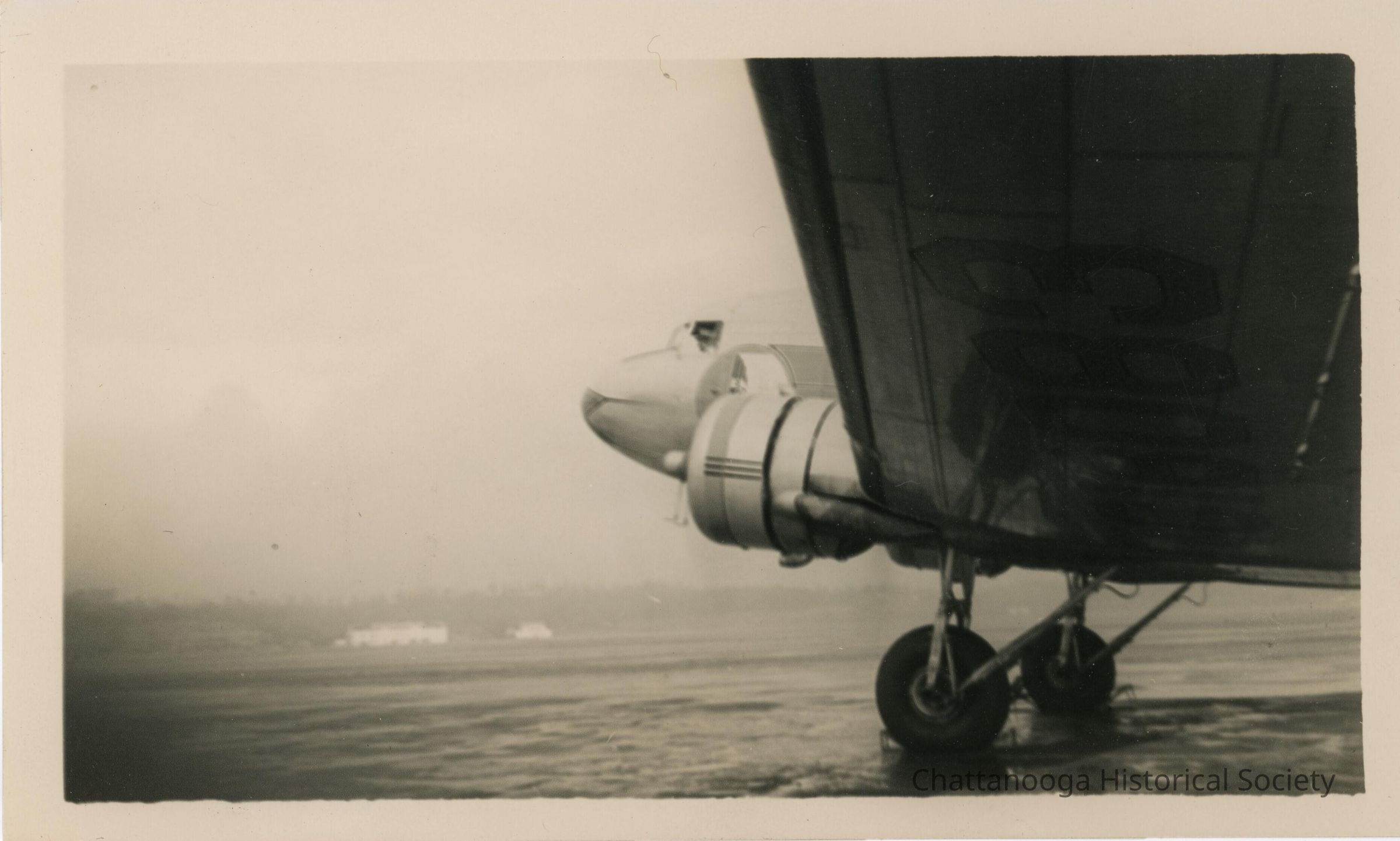 Black and white photograph of the nose and engine of one of the Eastern Airline's Douglas DC-3 airplanes. The propeller is in motion but the landing gear is chocked. The window is open. The photographer was standing underneath the plane's wing and white buildings can be seen in the background.Date(s) of Creation