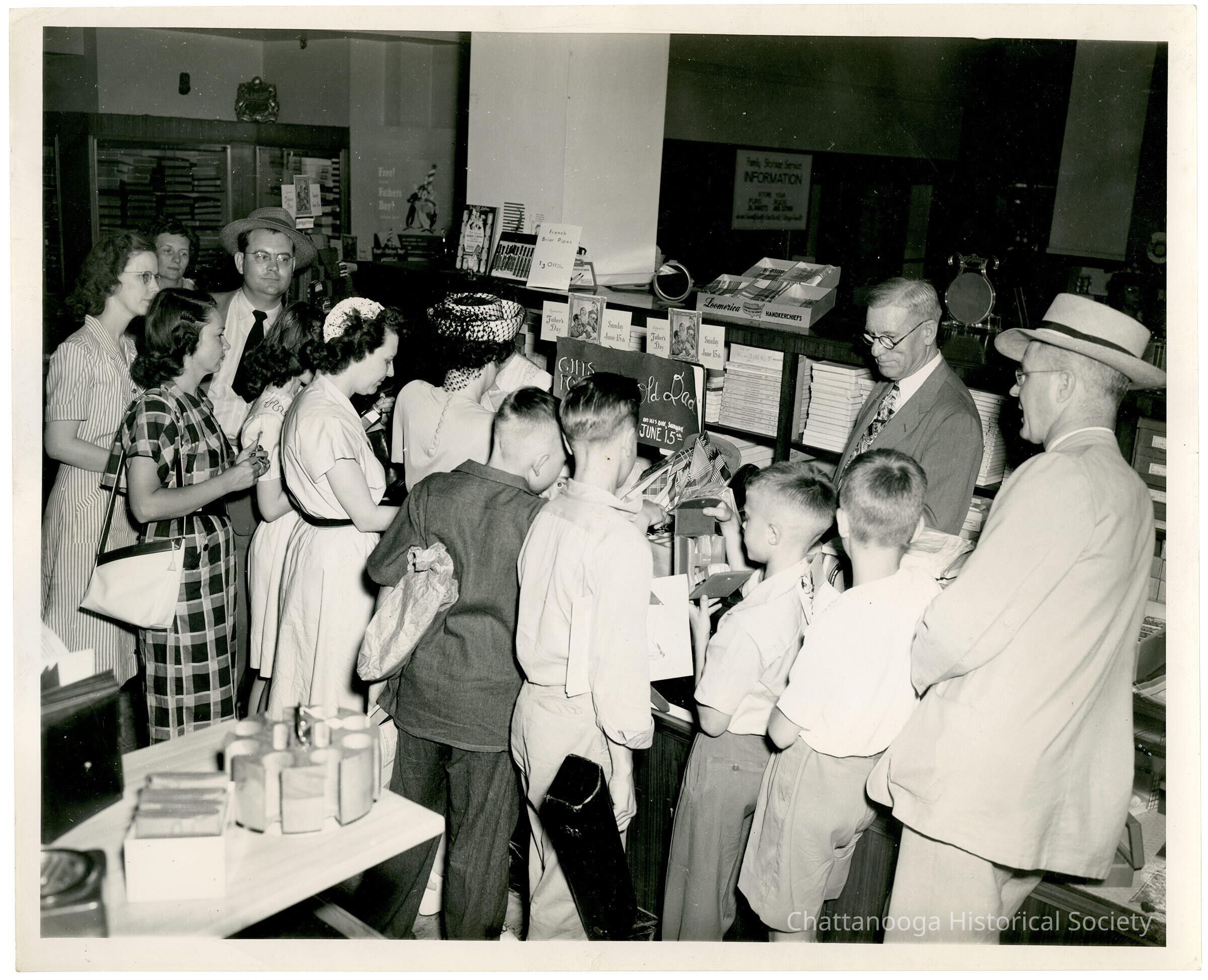 Photograph of thirteen visitors to Loveman's Department Store looking through a Father's Day Display. The salesman stands in the backgroundPhotograph Details