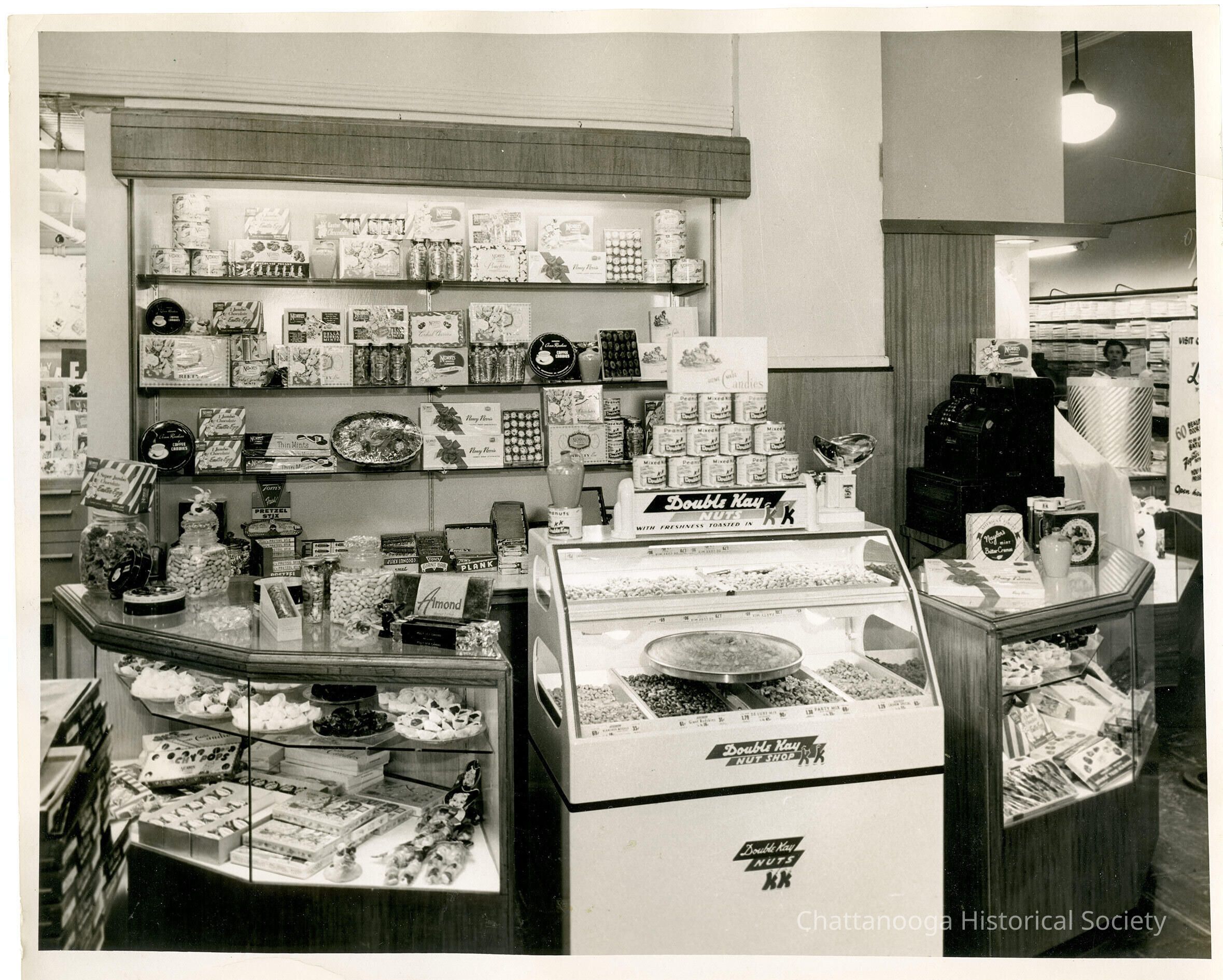 Black and white photograph of the Loveman's Department Store candy counter. The center display features the Double Kay Nut Shop and has a selection of nuts behind the glass while the flanking counters display other various candy boxes.Photograph Details