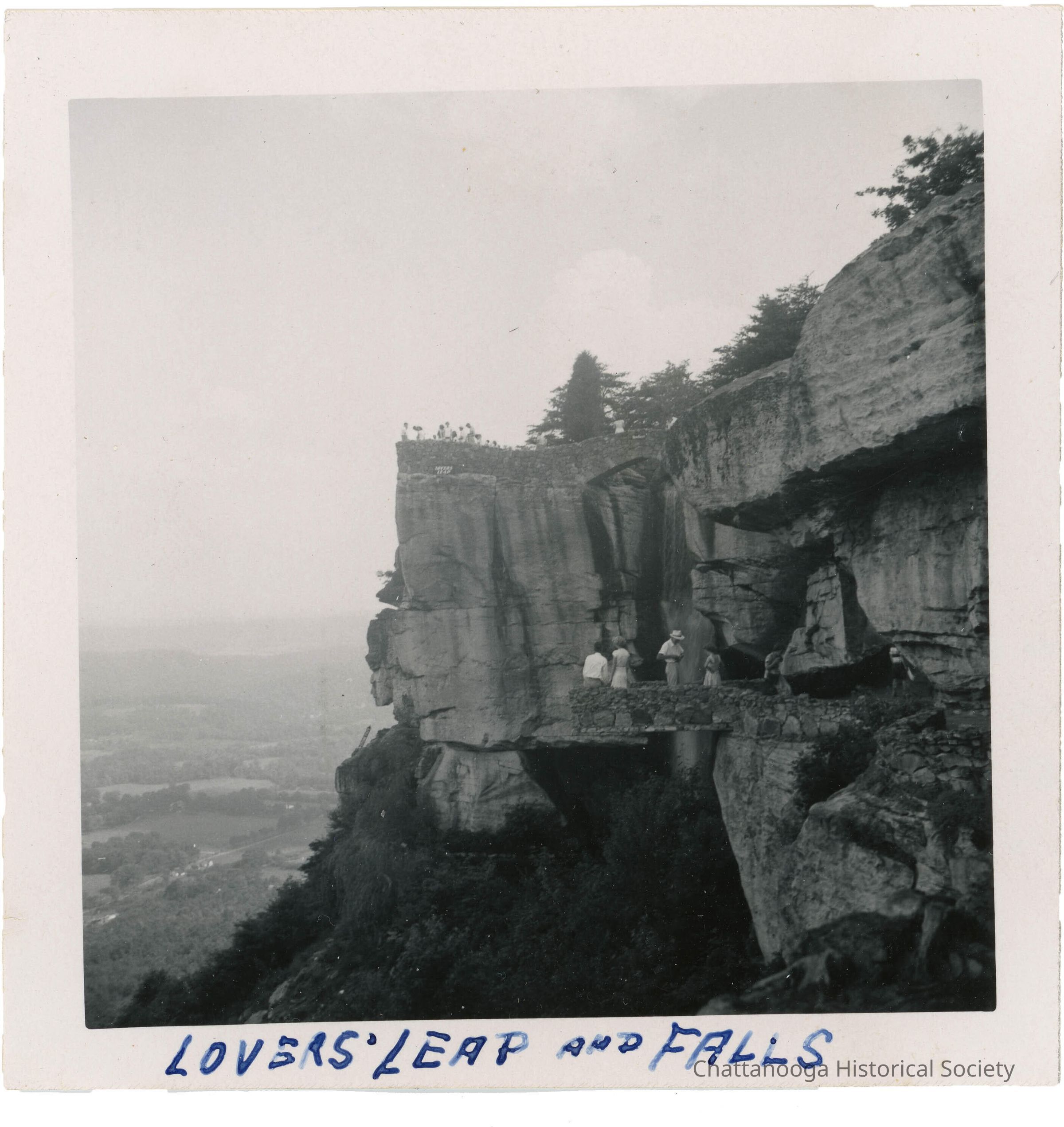 Black and white photograph of the "Lovers' Leap at Rock City with the falls below. The photograph shows a large group of tourists looking over the rock ledge down into the Chattanooga valley and the seven states that are visible from the top of Lookout Mountain. Below, other tourists are standing on the stone bridge looking at the High Falls above them.Photograph Details