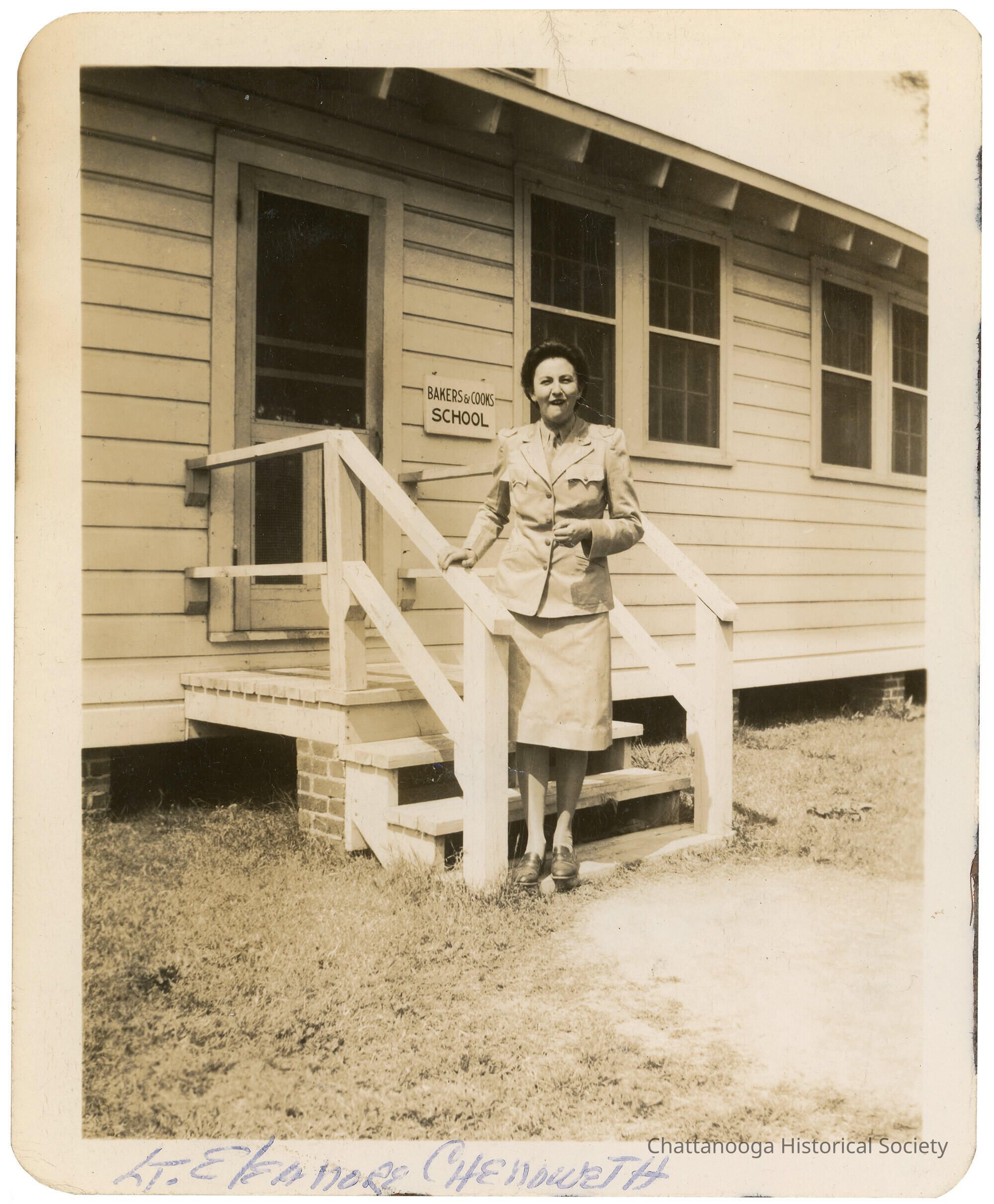 Black and white photograph of Lieutenant Eleanore Chenoweth standing in front of the Bakers & Cooks School at the WAC Training Center at Fort Oglethorpe. The woman is standing on the bottom step of the entrance of the school, with one hand on the rail. She is dressed in the WAC summer uniform and is making a face at the photographer. "Lt. Eleanore Chenoweth" is written in blue ink in the white border of the photograph. The same is written on the rear but it is partially obscured by improper removal from photo album before acquisition.Photograph Details