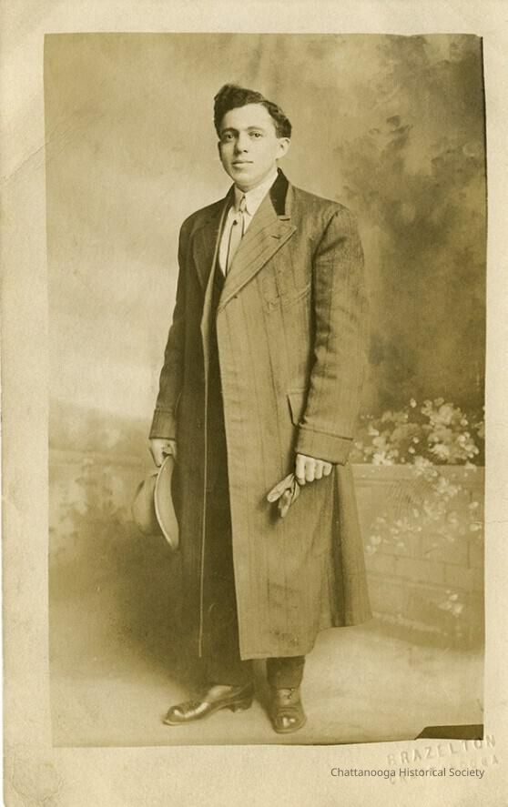 A black and white photograph developed on postcard paper of a man wearing a long striped suit coat. The is wearing a collared white shirt with a light tie tucked into a vest and brown shoes. He is holding a homburg or bowler type hat and gloves in his hands and he is posed in front of a studio backdrop. The photograph is embossed "Brazelton Chattanooga" on the bottom.Photograph Details