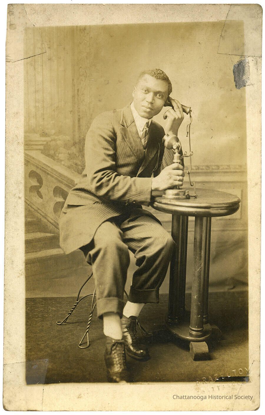 Black and white photograph developed on postcard paper of a man posed as if he is on a telephone call. The man is wearing a striped suit with rolled hem trousers. He has white stockings tucked into leather ankle height boots. He is sitting on a stool with twisted wire lege with one elbow perched on a four legged table as he is posed to look as if he is using the candlestick telephone that is placed on top of it. He is sitting in front of one of Brazelton's backdrops that features a painted stone balustrade and fluted column. "Brazelton Chattanooga" is embossed at the bottom right.Photograph Details