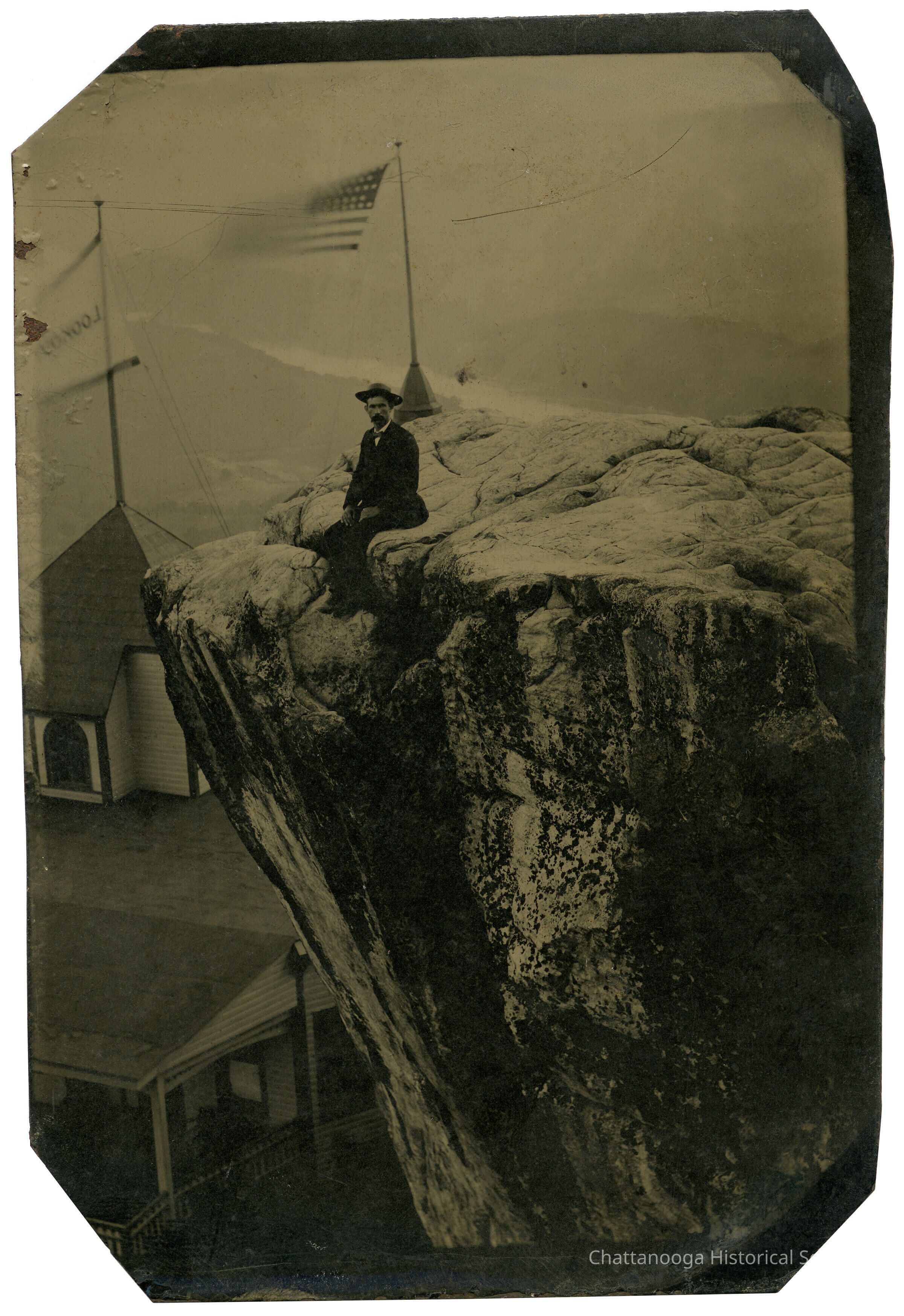 A black and white photograph developed on thin iron of a man wearing a dark suit and wide-brimmed hat. The man sits at the edge of Point Lookout, with his legs dangling off the edge. Below the outcropping is the Point Hotel. The tintype photographs shows two flags waving in the wind off the top of the hotel’s roof; one says “Lookout,” the other is an American flag. In the far distance is the Tennessee River.