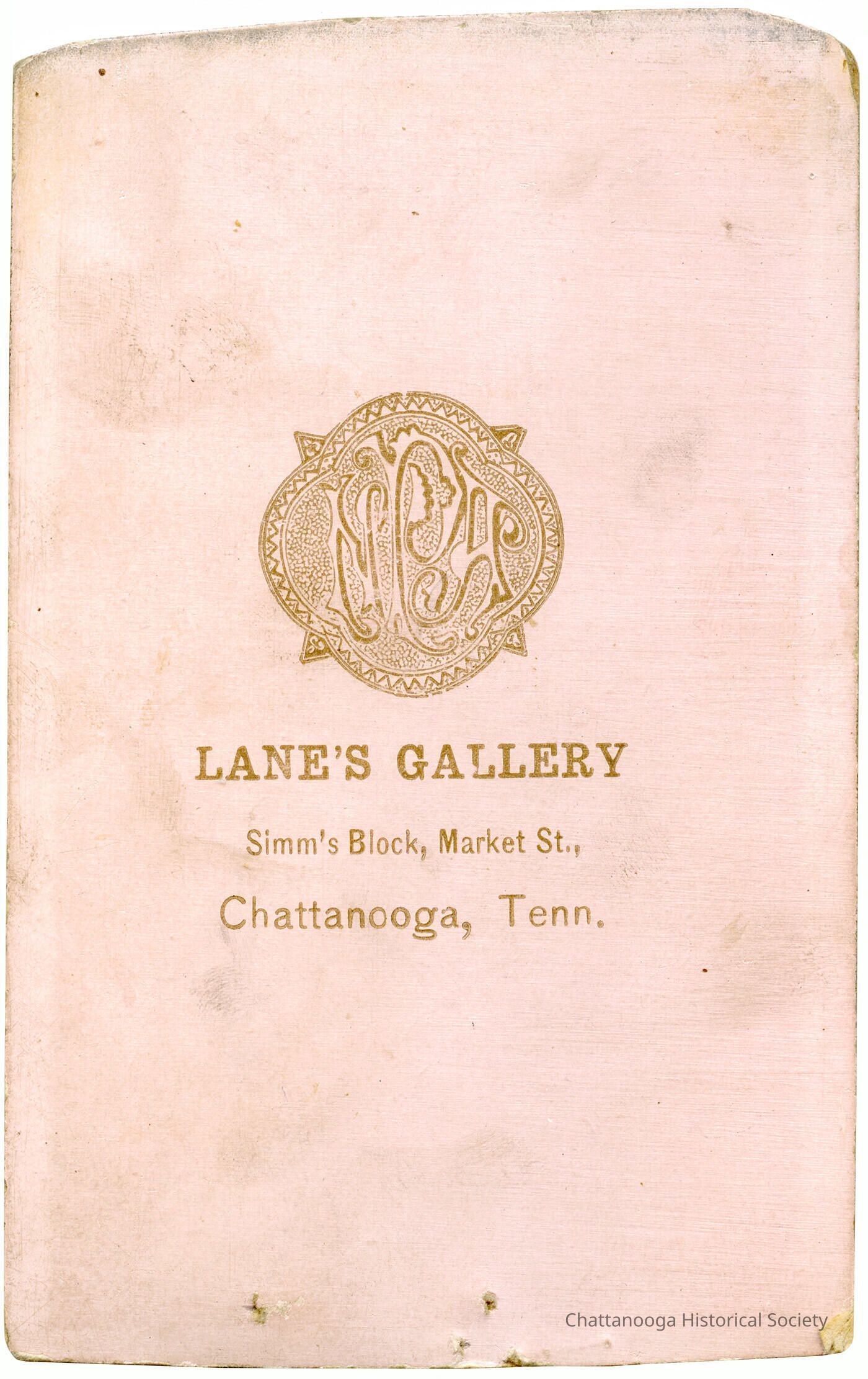 The card the photograph is mounted on is tinted pink. The rear has a seal at center with "NPA" at center and below that is "Lane's Gallery | Simm's Block, Market St., | Chattanooga, Tenn."Photograph Details