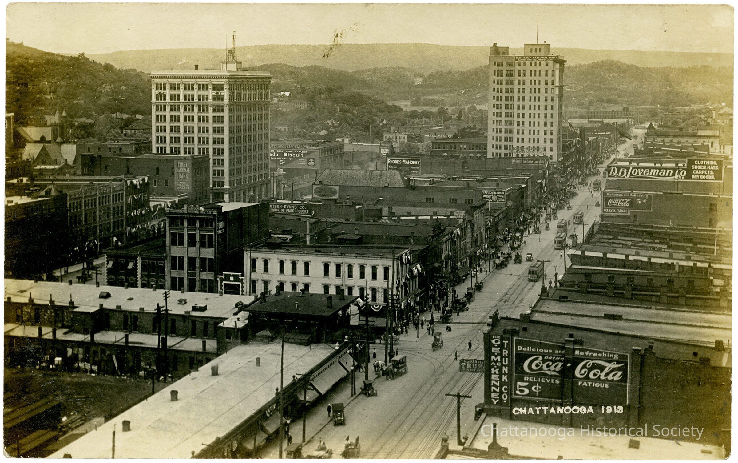A postcard with the front showing a photograph of downtown Chattanooga, Tennessee, from the Hotel Patten looking NE onto Market Street. Painted advertisements can be seen on the sides of buildings, including Coca-Cola (relieves fatigue), the GE MacKenney Trunk Co., DB Loveman CoPure Liquors, Rhodes Mahoney, First National Bank, Chattanooga Hardware CO. The street cars can be seen at the center of Market St. The postcard is labeled Chattanooga 1913Subject Place