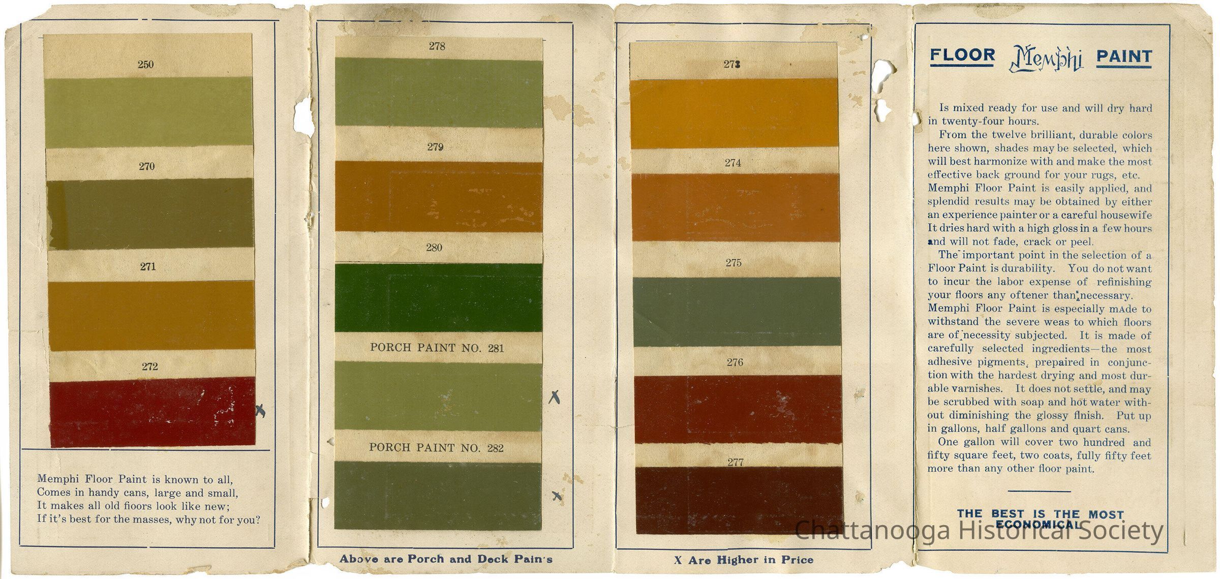 The interior features 14 paint and Porch and Deck stain samples. Underneath the first column reads "Memphi Floor Paint is known to all, Comes in handy cans, large and small, It makes all old floors look like new; If it's best for the masses, why not for you?"Collection