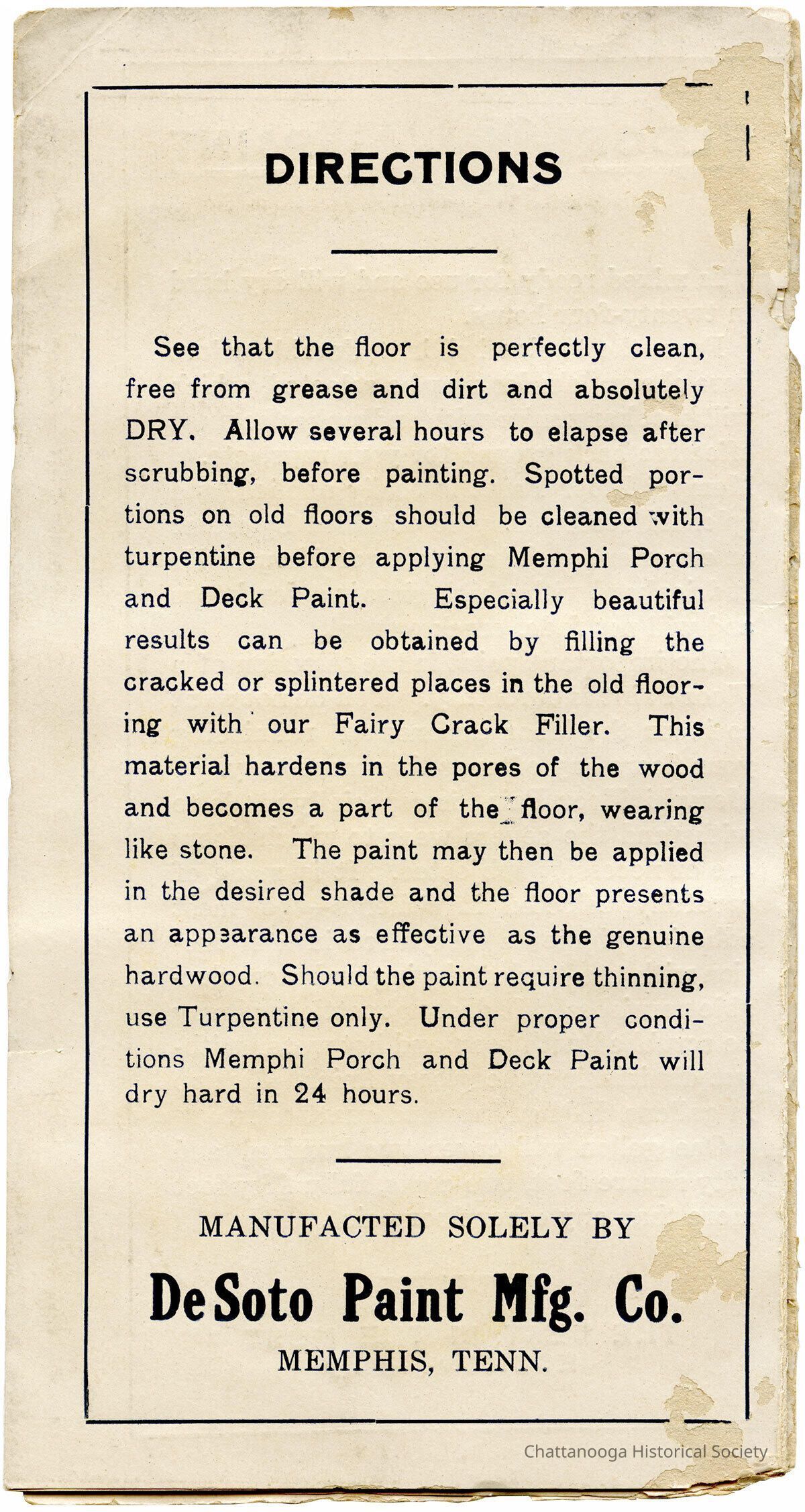 A fold-out brochure for Memphi Floor Paint, distributed through Fritts and Wiehl Wholesale Distributors on Market and Broad Streets. Manufactured by the DeSoto Paint Manufacturing Co. of Memphis, Tennessee.