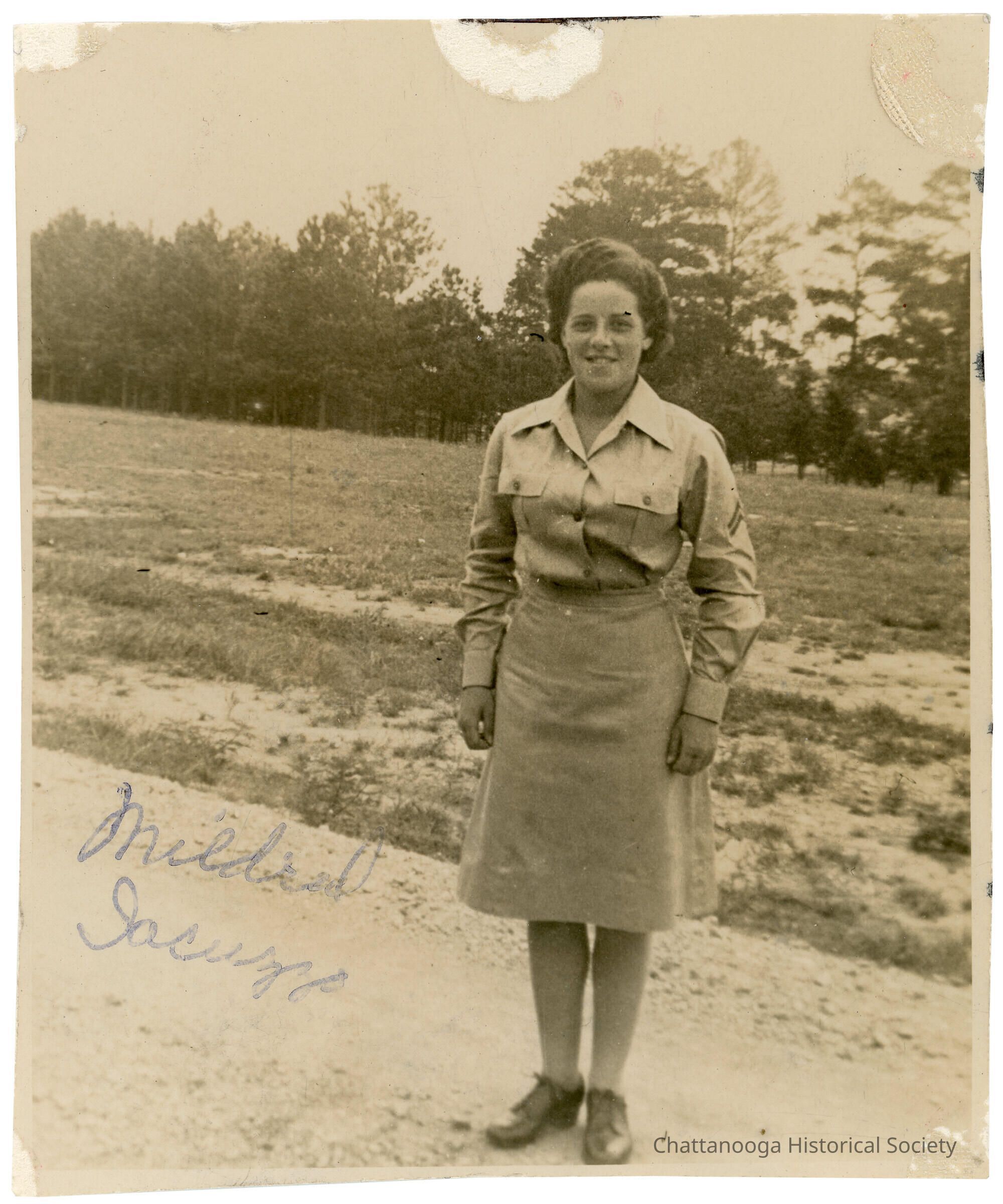 Black and white photograph of a woman in a summer uniform. She is standing on a dirt road with a grass field behind her. The two sleeve stripes on her shoulder indicate a corporal rank. "Mildred Jacuzzo" is written in blue ink on the photos front, left and is written on the rear with a portion of the last name cut off. The rear is also stamped in black ink "Shannon's Studio, 726 1/2 , Jul 21 1943, Market St, Chattanooga, Tenn." It should be noted that this photo is dated a few weeks after the passing of the Public Law 78-110 that granted the WAAC full military status as renamed WAC.Photograph Details