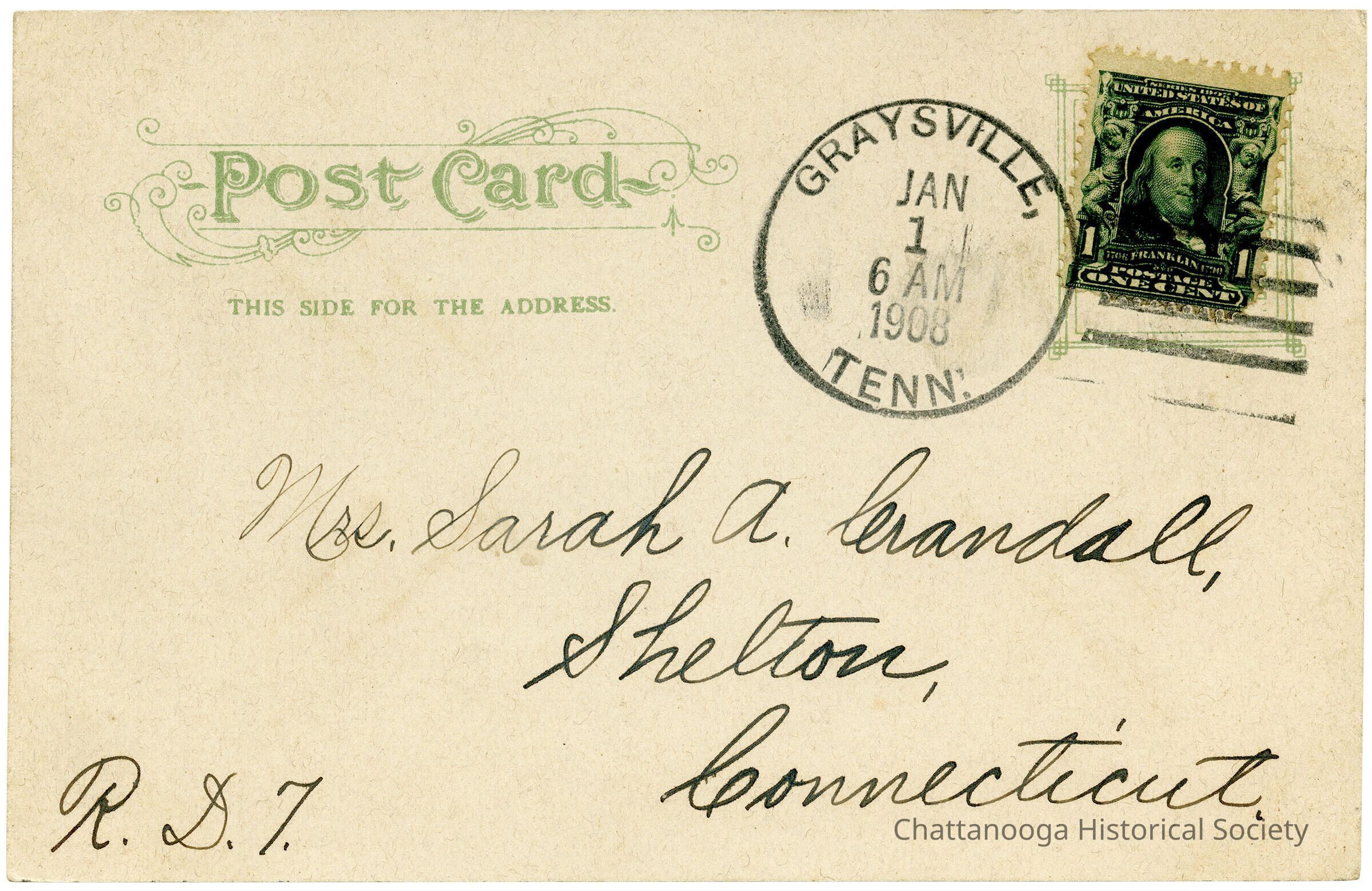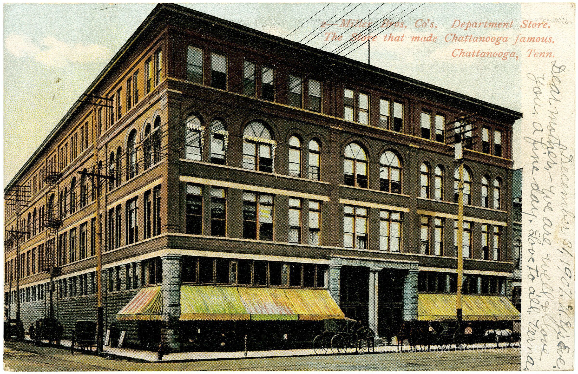 A postcard with the front showing a color-tinted photograph of the Miller Brothers Company Department Store at 629 Market Street. The front reads "Miller Bros. Co.'s Department Store. The Store that made Chattanooga famous. Chattanooga, Tenn."