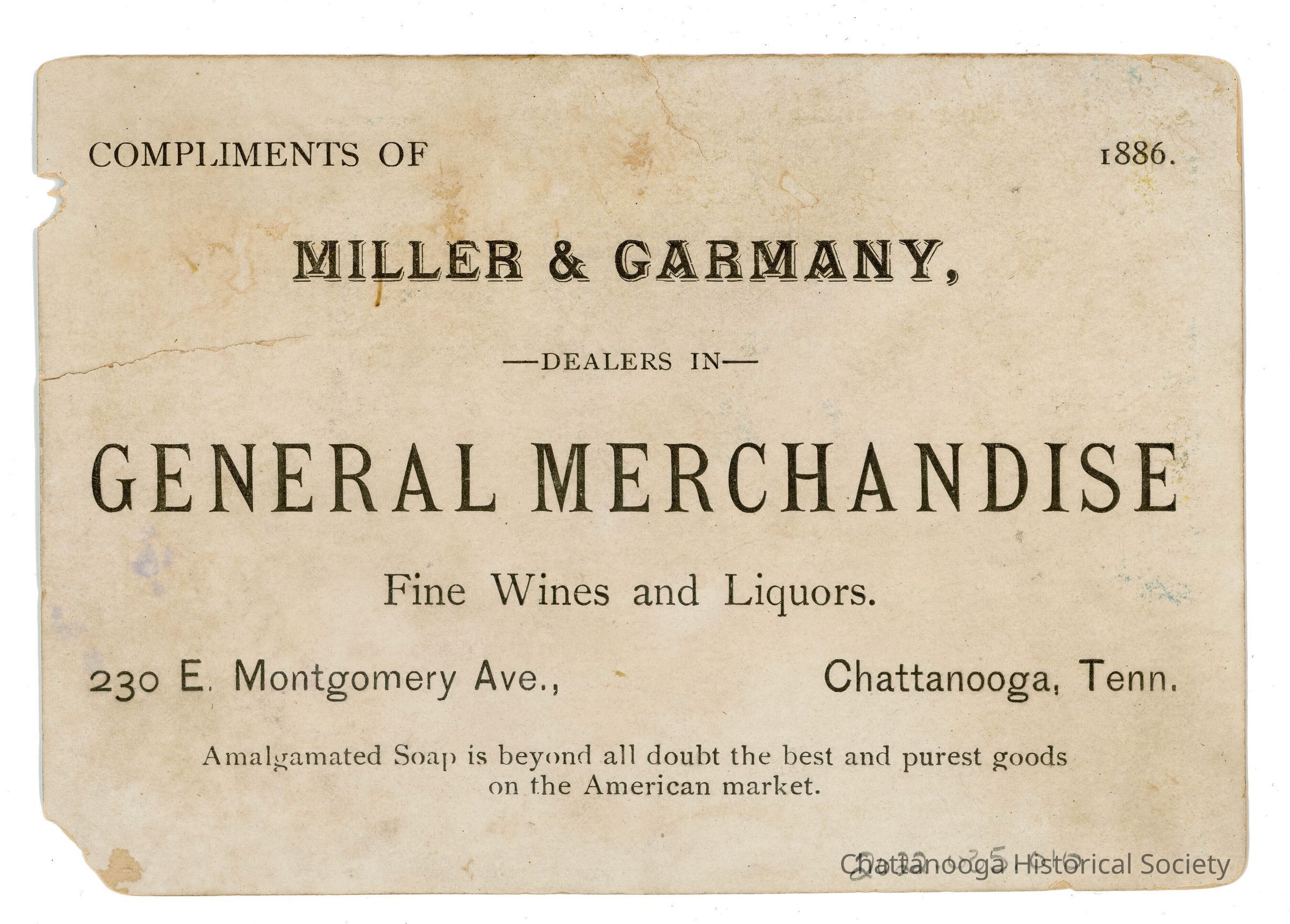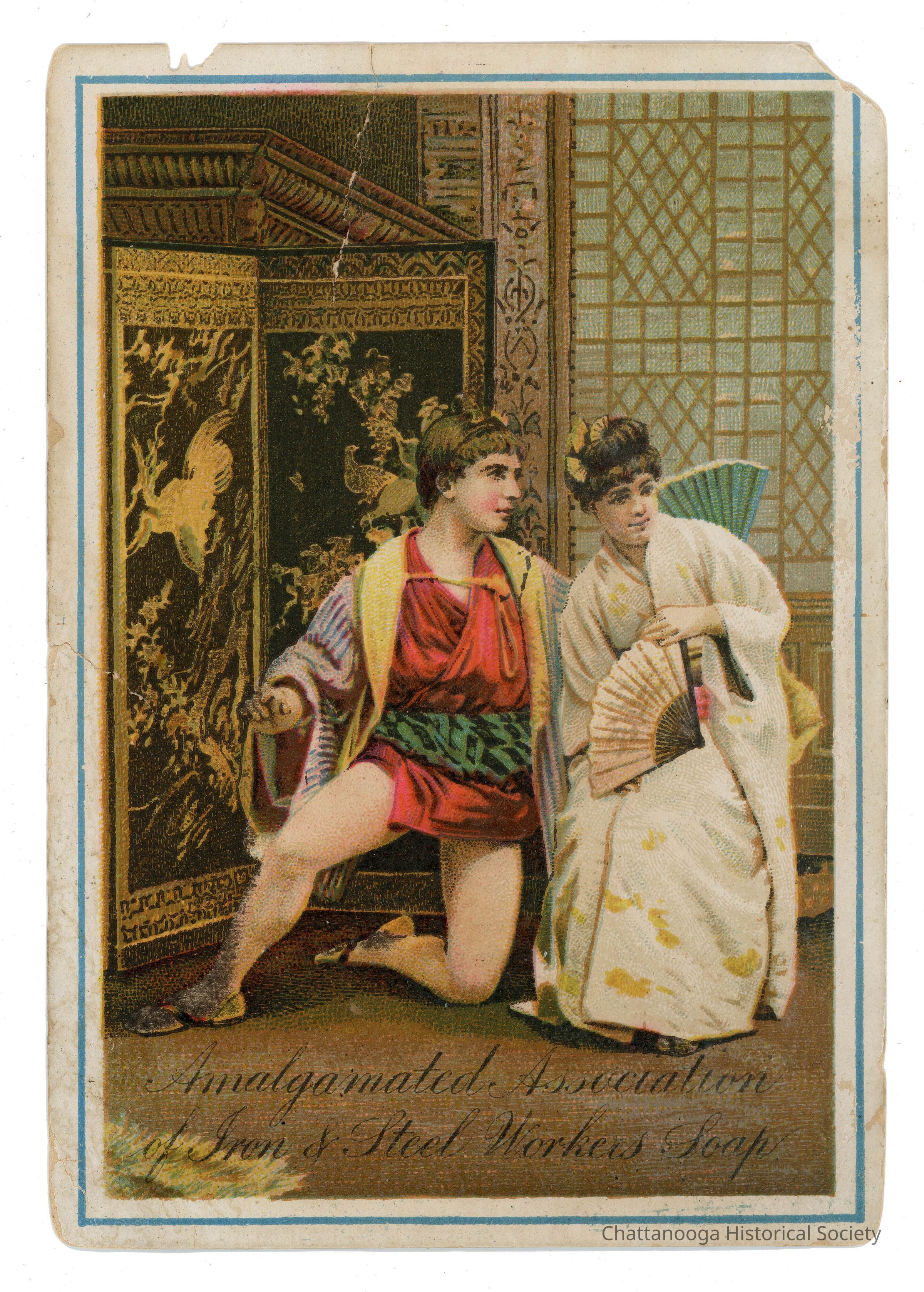 A trade card from Miller & Garmany for the Amalgamated Association of Iron and Steel Workers. The trade card front features a halftone lithograph of two actors portraying characters in vaguely Asian costuming. Written in cursive at the bottom is "Amalgamated Association of Iron and Steel Workers Soap". The opposite side reads "Compliments of Miller & Garmany, Dealers in General Merchandise Fine Wines and Liquors, 230 E. Montgomery Ave., Chattanooga, Tenn. Amalgamated Soap is beyond all doubt the best and purest goods on the American market" and is dated 1886 at the top right.Collection