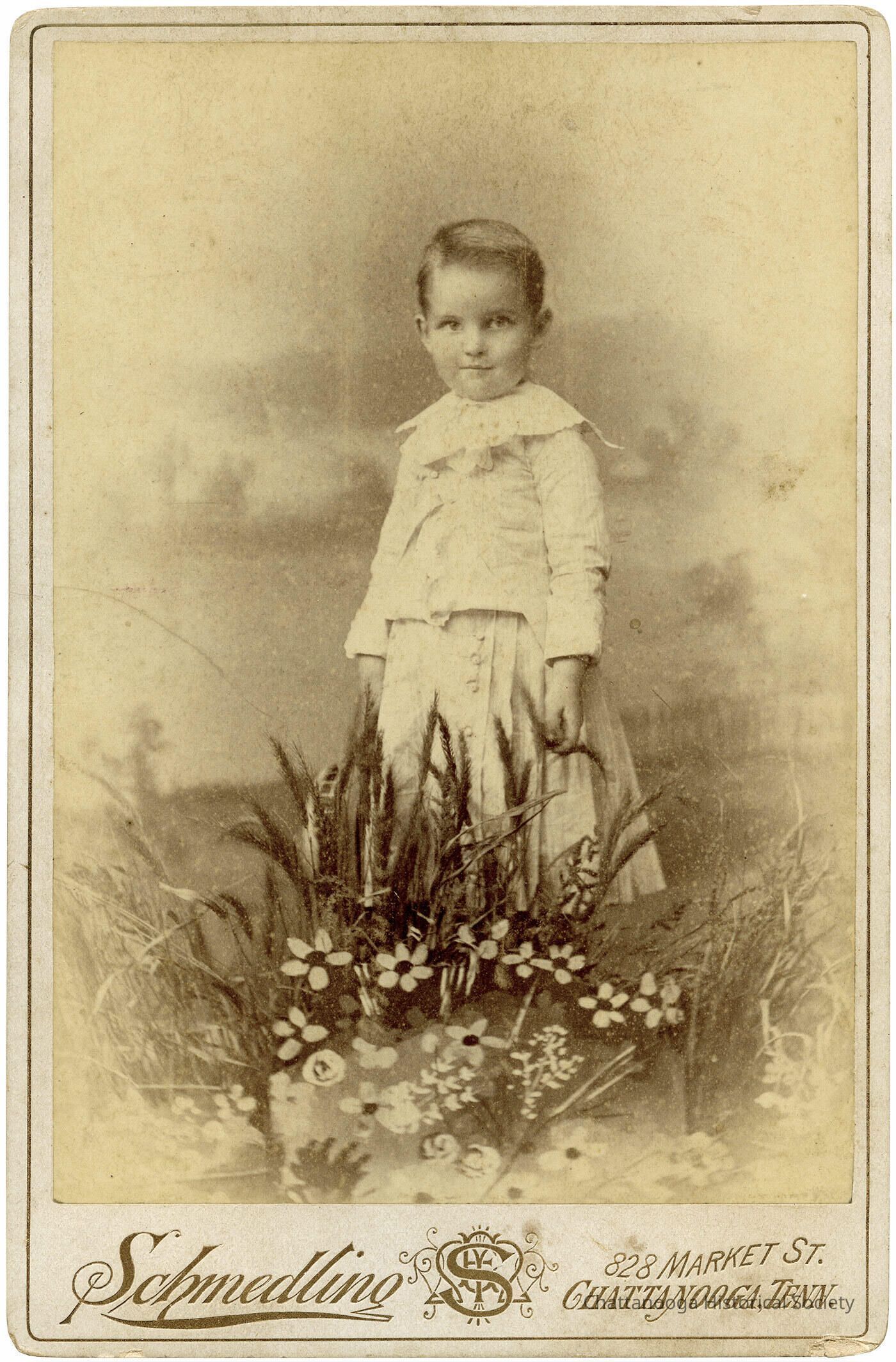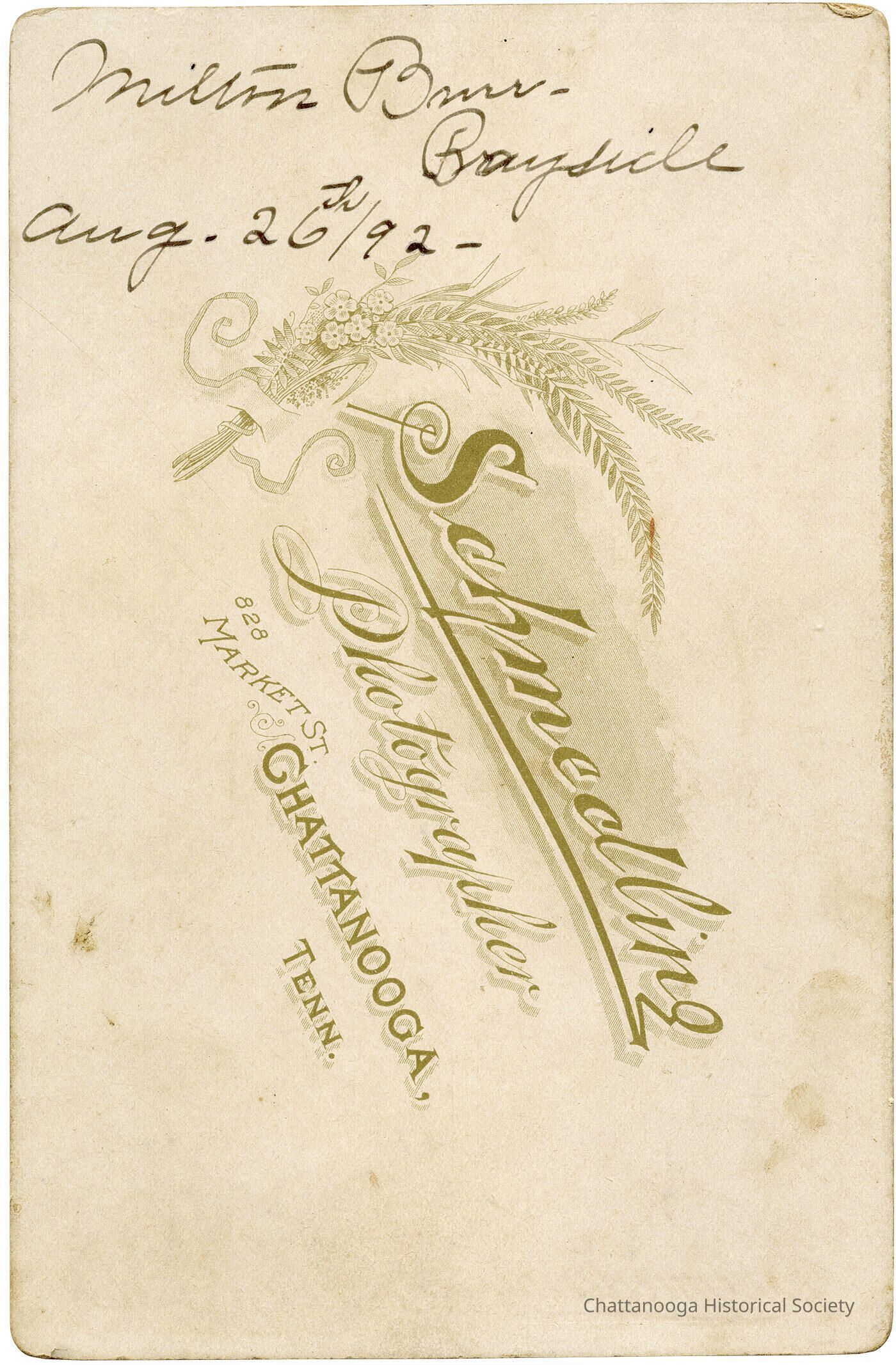 "Milton Burr-Brayside Aug. 26th, 1892" is written in ink on the rear. There is also a lithograph reading "Schmedling Photographer, 828 Market St. Chattanooga, Tenn." with an image of a bouquet of flowers and ferns.Photograph Details